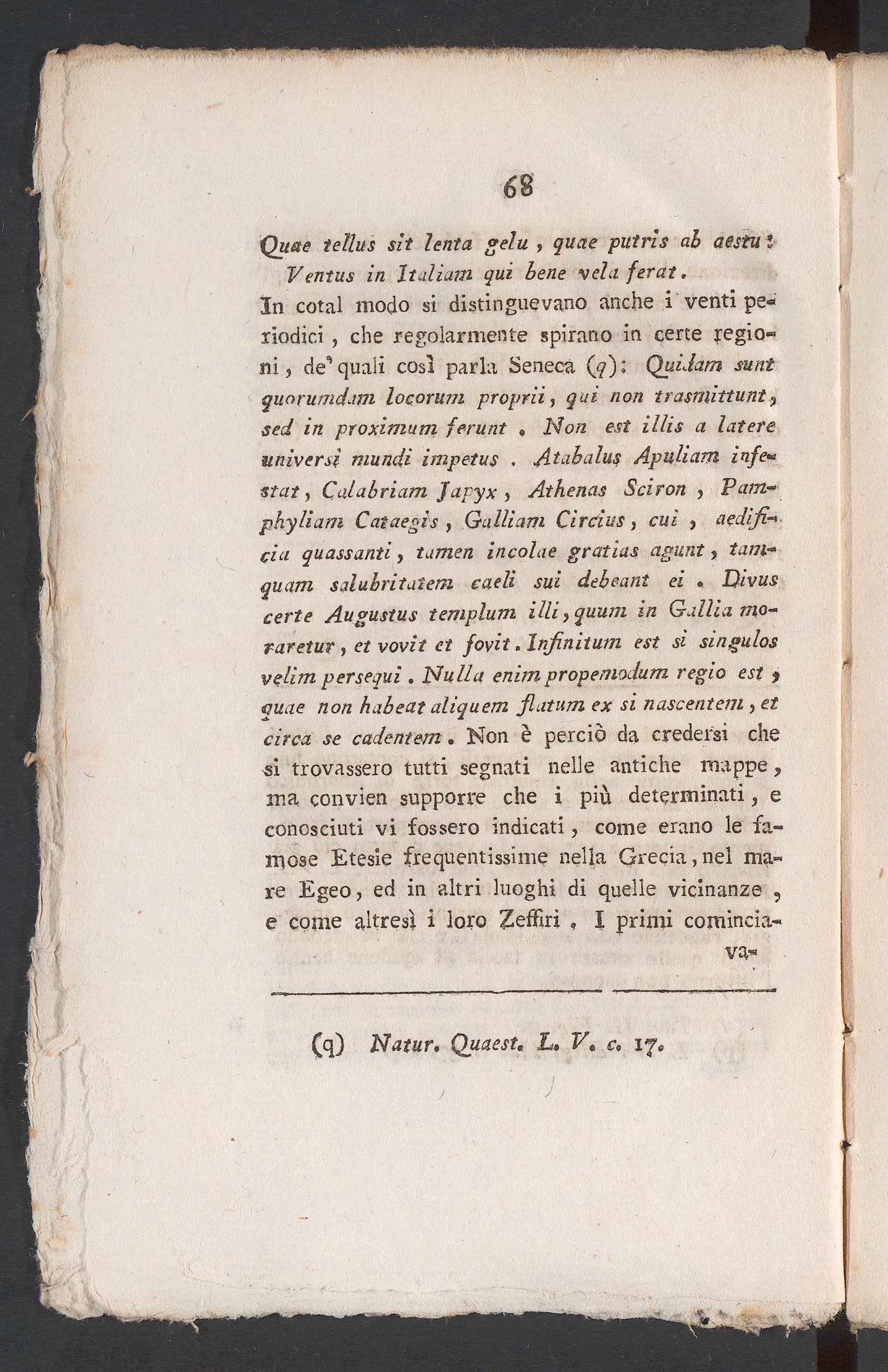 In cotal modo si distinguevano anche i venti pe-riodici , che regolarmente spirano in certe regio-ni , de’ quali cosi parla Seneca (.7) ; Quidam suntquorumd.im locorum proprii, qui non trasmittunt,sed in proximum ferunt , Non est illis a Intereuniversi mundi impetus . Atabalus Apuliam infe -stat , Calabriam Japyx , Athenas Sciron , Vam~phyliam Cataegis , Galliam Circhi s , cui , aedifi-*■eia quassanti , 1'.amen incoine gratias agunt, tam -quam sdubritatem cadi sui debeani ei . Divuscerte Augustus templum illi, quum in Gallici mo-raretur, et vovìt et fovit .Infinitum est si singulosvelim persequi . Nulla enimpropemodum regio est »quae non habeat aliquem jlatum ex si nascentem , etcirca se cadentetn . Non è perciò da credersi cheai trovassero tutti segnati nelle antiche mappe 7ma convien supporre che i più determinati, econosciuti vi fossero indicati, come erano le fa-rnese Efesie frequentissime nella Grecia,nel ma-re Egeo, ed in altri luoghi di quelle vicinanze ,e come altresì i loro Zeffiri , I primi comincia-va-