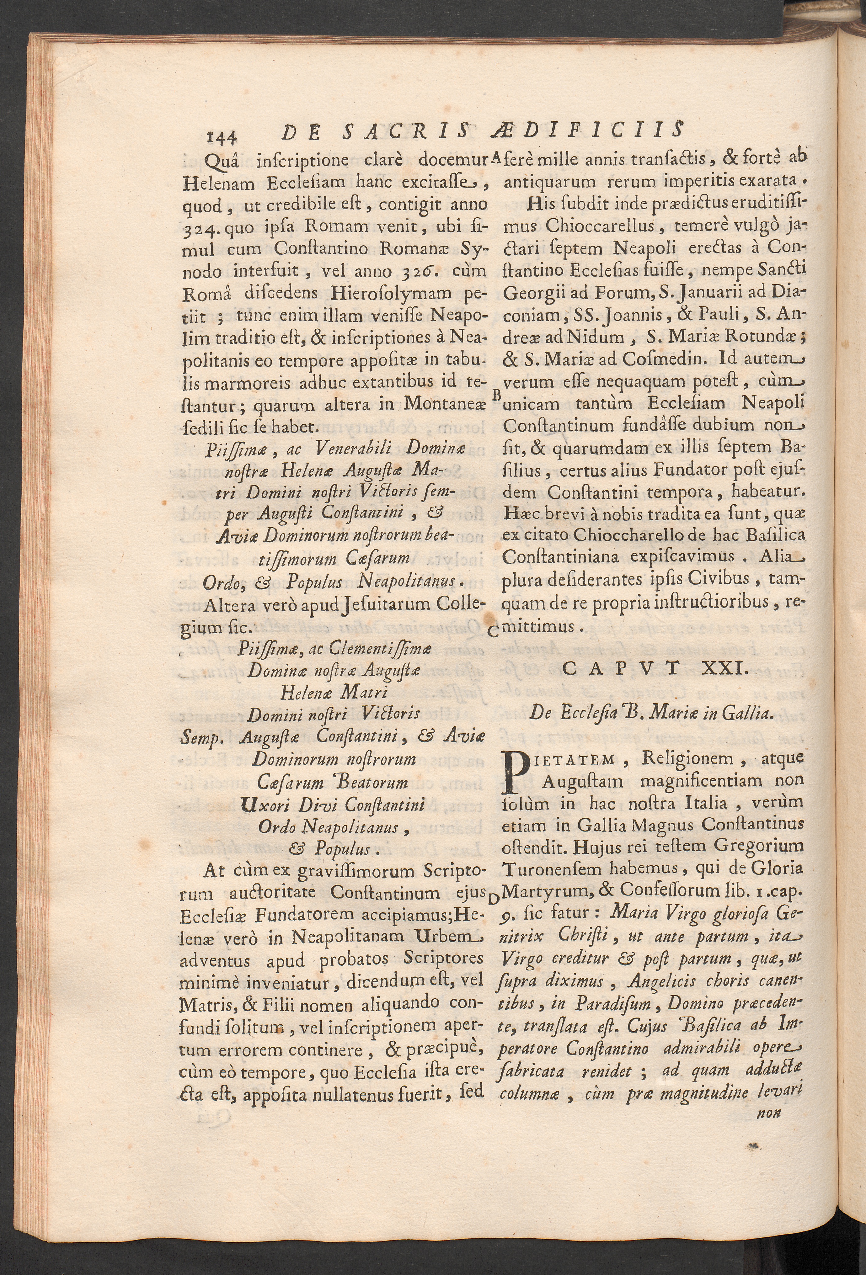 Qua inscriptione clare docemurAsere mille annis transactis , & forte al>Helenann Ecclesiam hanc excicasse_», antiquarum rerum imperitis exarata .quod , ut credibile est , contigit anno His subdit inde prodictus eruditissi*324. quo ipsa Romam venit, ubi st- mus Chioccarellus, temere vulgo ja-mul cum Constantino Romana Sy- ctari septem Neapoli erectas a Con-nodo interfuit, vel anno 326°. cum stantino Ecclesias fuisse, nempe SanctiRoma discedens Hierosolymam pe- Georgii ad Forum, S. Januarii ad Dia-tiit ; tunc enim illam venisse Neapo- coniam, SS.Joannis , & Pauli, S. An-]im traditio est, & inscriptiones a Nea- dreae ad Nidum , S. Marias Rotunda;politanis eo tempore appositae in tabu- & S. Maris ad Cosmedin. Id autem-»lis marmoreis adhuc extantibus id te- verum este nequaquam potest, cum-»stantur; quarum altera in Montanes ^unicam tantum Ecclesiam Neapoli