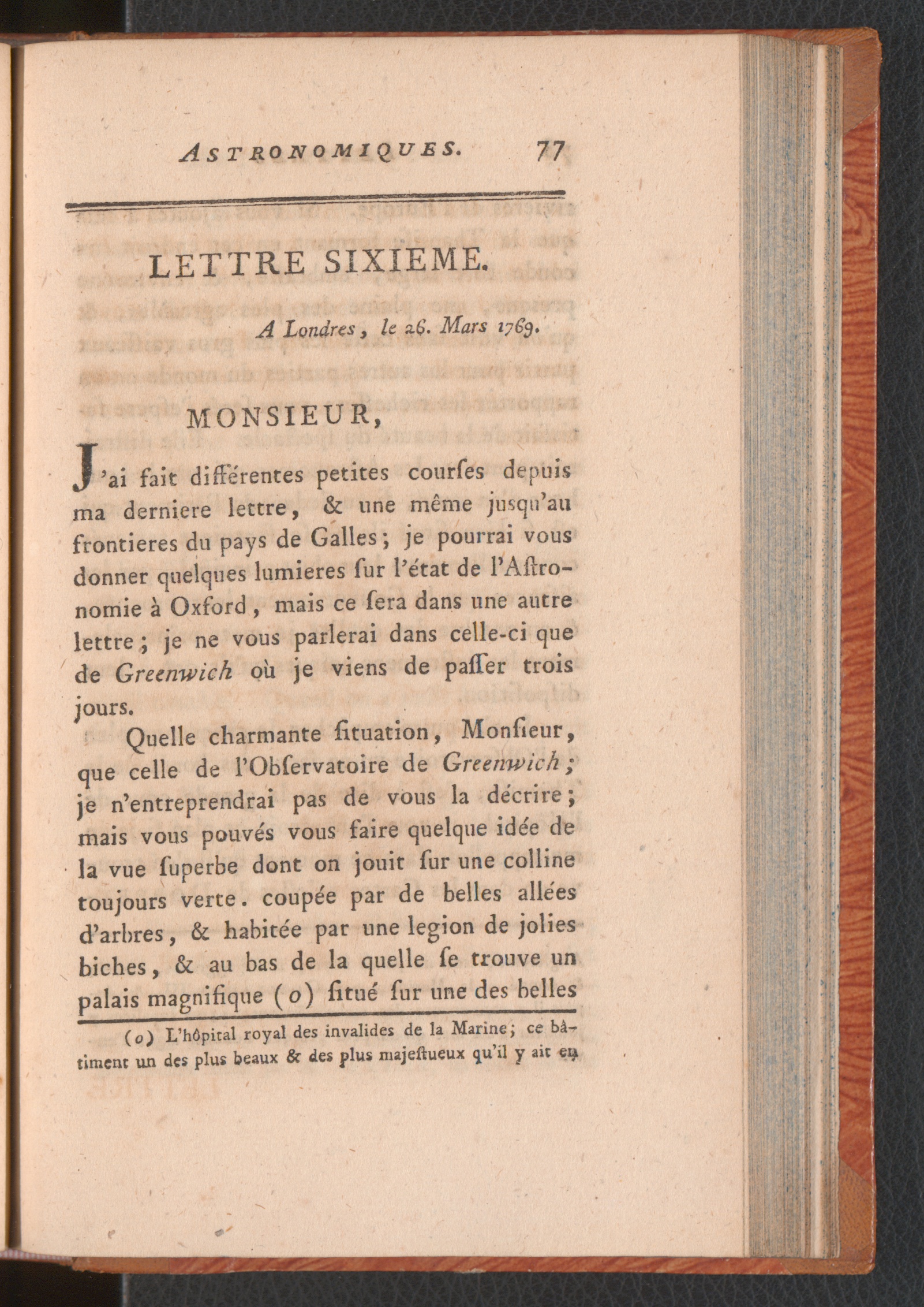 Quelle charmante situation, Monsieur,que celle de l'Observatoire de Greenwich ;je n’entreprendrai pas de vous la décrire ;mais vous pouvés vous faire quelque idée dela vue superbe dont on jouit sur une collinetoujours verte. coupée par de belles alléesd’arbres, & habitée par une légion de joliesbiches, & au bas de la quelle se trouve unpalais magnifique (o) fitué fur une des belles