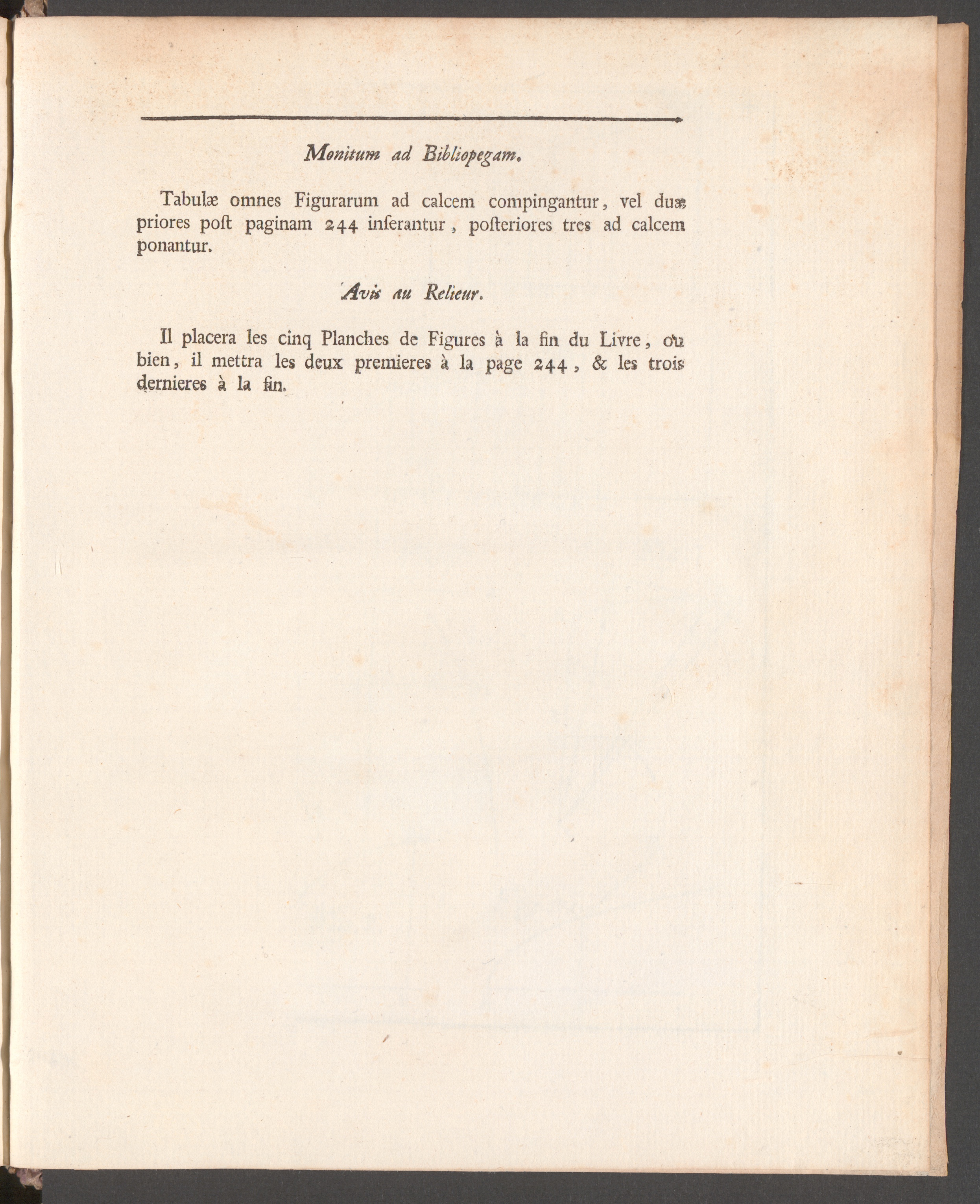 II placera les cinq Planches de Figures a la fin du Livre, o\ibien, 11 mettra les deux premieres ä la page 244 , & les troisdernieres k la fin.