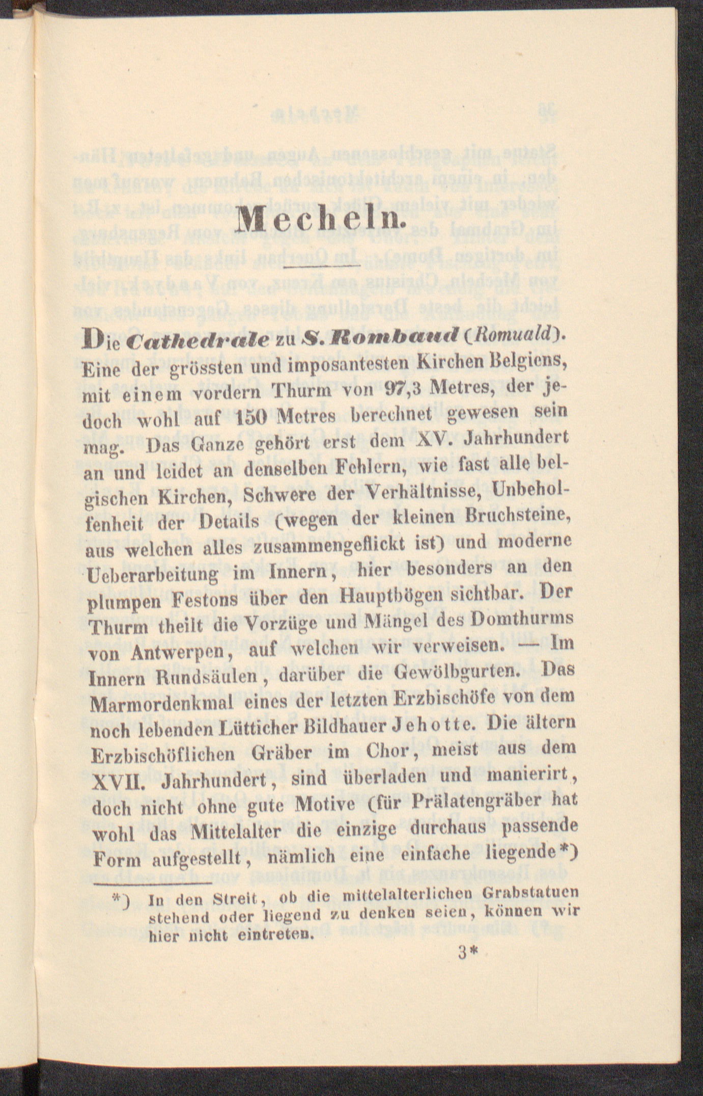 Die Cathedrate zu Romband CHomuald ).Eine der grössten und imposantesten Kirchen Belgiens ,mit einem vordem Thurm von 97,3 Metres, der je-doch wohl auf 150 Metres berechnet gewesen seinmag. Das Ganze gehört erst dem XV. Jahrhundertan und leidet an denselben Fehlern, Avie fast alle bel-gischen Kirchen, Schwere der Verhältnisse, Unbehol-fenheit der Details (wegen der kleinen Bruchsteine,aus welchen alles zusammengeflickt ist) und moderneUcbcrnrbeitung im Innern, hier besonders an denplumpen Festons über den Hauptbögen sichtbar. DerThurm theilt die Vorzüge und Mängel des Domthurmsvon Antwerpen , auf welchen wir verweisen. — lmInnern Rundsäulen, darüber die Gewölbgurten. DasMarmordcnkmal eines der letzten Erzbischöfe von demnoch lebenden Lütticher Bildhauer Jehotte. Die älternErzbischöflichen Gräber im Chor, meist aus demXVII. Jahrhundert, sind überladen und manierirt,doch nicht ohne gute Motive (für Prälatengräber hatwohl das Mittelalter die einzige durchaus passendeForm aufgestellt, nämlich eine einfache liegende*)