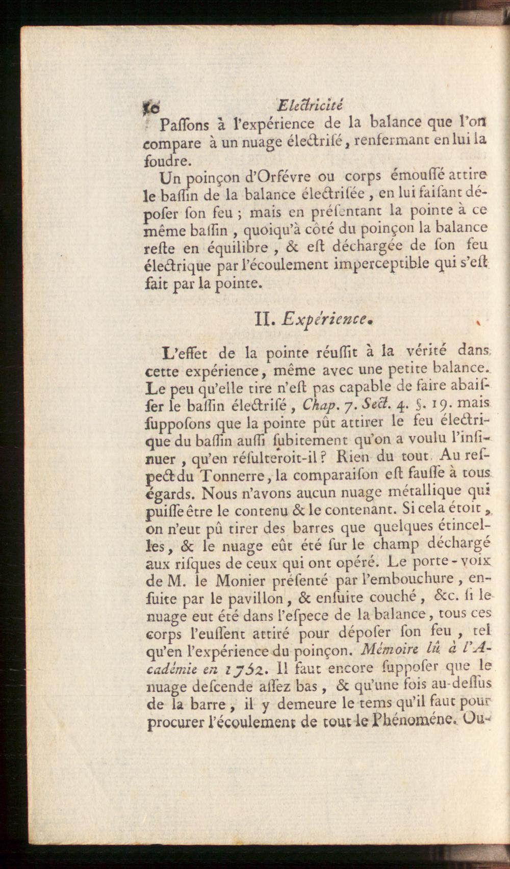 L’esset de la pointe réussit à la vérité danscette expérience, même avec une petite balance.Le peu qu’elle tire n’est pas capable de faire abaisfer le bassin électrifé , Chap. 7. Sect. 4. 5. 19. maissupposons que la pointe pût attirer le feu électri-que du bassin aussi subitement qu’on a voulu l’inlì-nuer , qu’en résulteroit-il ? Rien du tout. Au res-pect du Tonnerre, la comparaison est fausse à touségards. Nous n’avons aucun nuage métallique quipuisse être le contenu & le contenant. Si cela étoit,on n’eut pû tirer des barres que quelques étincel-les , & le nuage eût été fur le champ déchargéaux risques de ceux qui ont opéré. Le porte-voixde M. le Monier présenté par l’embouchure , en-suite par le pavillon, & ensuite couché , &c. li lenuage eut été dans l’efpece de la balance, tous cescorps l’eussent attiré pour déposer son feu , telqu’en l’expérience du poinçon. Mémoire lû. à V A-cadémie en ijáz. 11 faut encore supposer que lenuage descende assez bas , & qu’une fois au-dessusde la barre , il y demeure le tems qu’il faut pourprocurer l’écoulement de tout le Phénomène. Ou--
