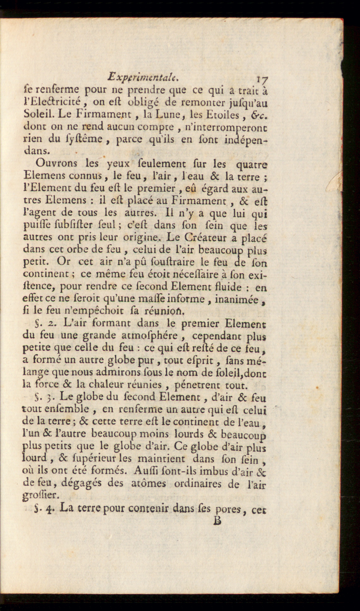 Ouvrons les yeux seulement sur les quatreElemens connus, le feu, l’air, leau & la terre ;l’Element du feu est le premier, eû égard aux au-tres Elemens : il est placé au Firmament , & estl’agent de tous les autres. II n’y a que lui quipuisse subsister seul ; c’est dans son sein que lesautres ont pris leur origine. Le Créateur a placédans cet orbe de feu , celui de l’air beaucoup pluspetit. Or cet air n’a pû soustraire le feu de soncontinent ; ce même feu étoit nécessaire à son exi-stence, pour rendre ce second Element fluide : enessetee ne scroic qu’une malse informe , inanimée ,si le feu n’empêchoit sa réunion.