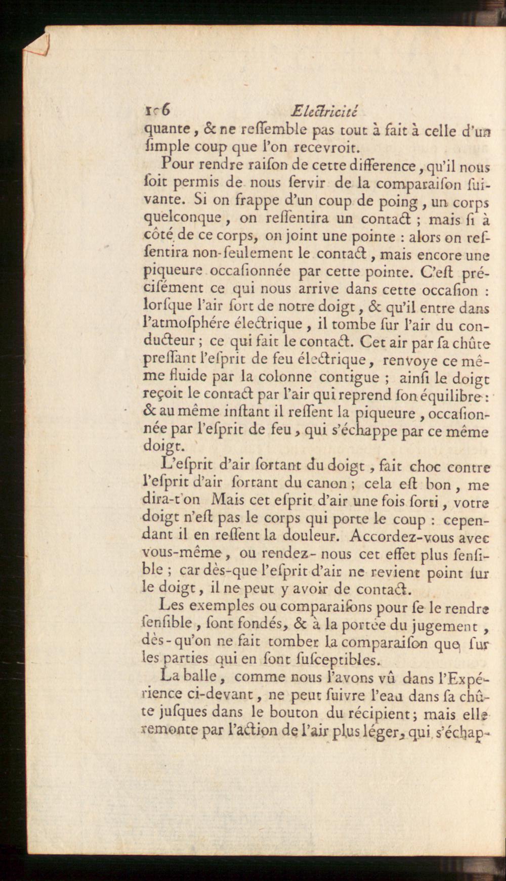 Pour rendre raison de cette disserence ,qu’il noussoit permis de nous servir de la comparaison sui-vante. Si on frappe d’un coup de poing , un corpsquelconque, on reíìèntira un contact ; mais si àcôté de ce corps, on joint une pointe : alors on res-sentira non-seulement le contact , mais encore unepiqueure occasionnée par cette pointe. C’est pré-cisément ce qui nous arrive dans cette occasion :lorsque l’air sort de notre doigt, & qu’il entre dansl’atmosphére électrique , il tombe sur l’air du con-ducteur ; ce qui fait le contact. Cet air par sa chutepressant l’esprit de feu électrique, renvoyé ce mê-me fluide par la colonne contigue ; ainsi le doigtreçoit le contact par l’air qui reprend ion équilibre:6c au même instant il ressent la piqueure , occasion-née par l’esprit de feu, qui s’échappe par ce mêmedoigt.
