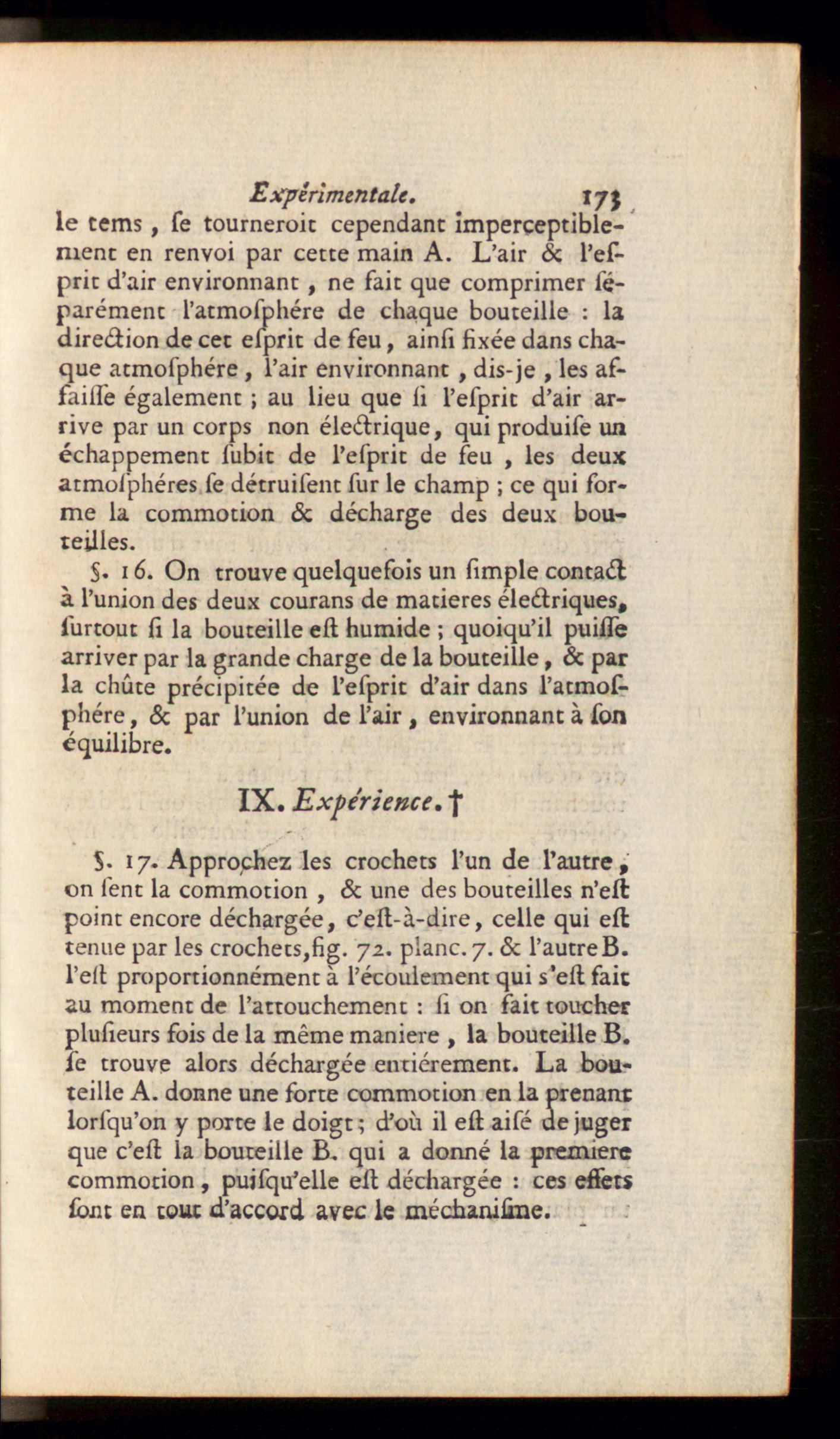 $. 17. Approchez les crochets l’un de l'autre,on lent la commotion , & une des bouteilles n’estpoint encore déchargée, c’est-à-dire, celle qui esttenue par les crochets,fig. 72. plane. 7. & l’autre B.l’elt proportionnément à l’écoulement qui s'est faitau moment de l’attouchement : si on fait toucherplusieurs fois de la même maniéré , la bouteille B.se trouve alors déchargée entièrement. La bou-teille A. donne une forte commotion en la prenantlorl'qu’on y porte le doigt; d’où il est aisé déjugerque c’est la bouteille B. qui a donné la premièrecommotion, pujsqu'elle est déchargée : ces essetsfont en tout d’accord avec le méchanilme.