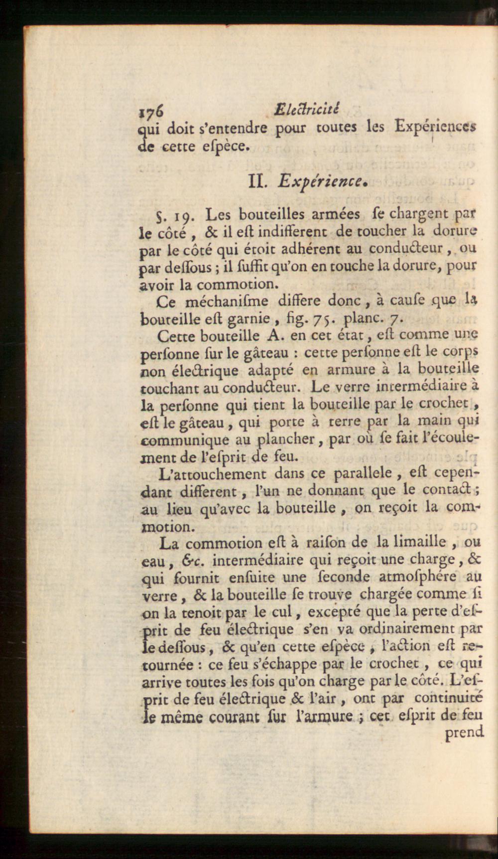 Cette bouteille A. en cet état, est comme unepersonne sur le gâteau : cette personne est le corpsnon électrique adapté en armure à la bouteilletouchant au conducteur. Le verre intermédiaire àla personne qui tient la bouteille par le crochet ,est le gâteau, qui porte à terre par la main quicommunique au plancher, par où se fait l’écoule-ment de l’esprit de feu. ’ ;