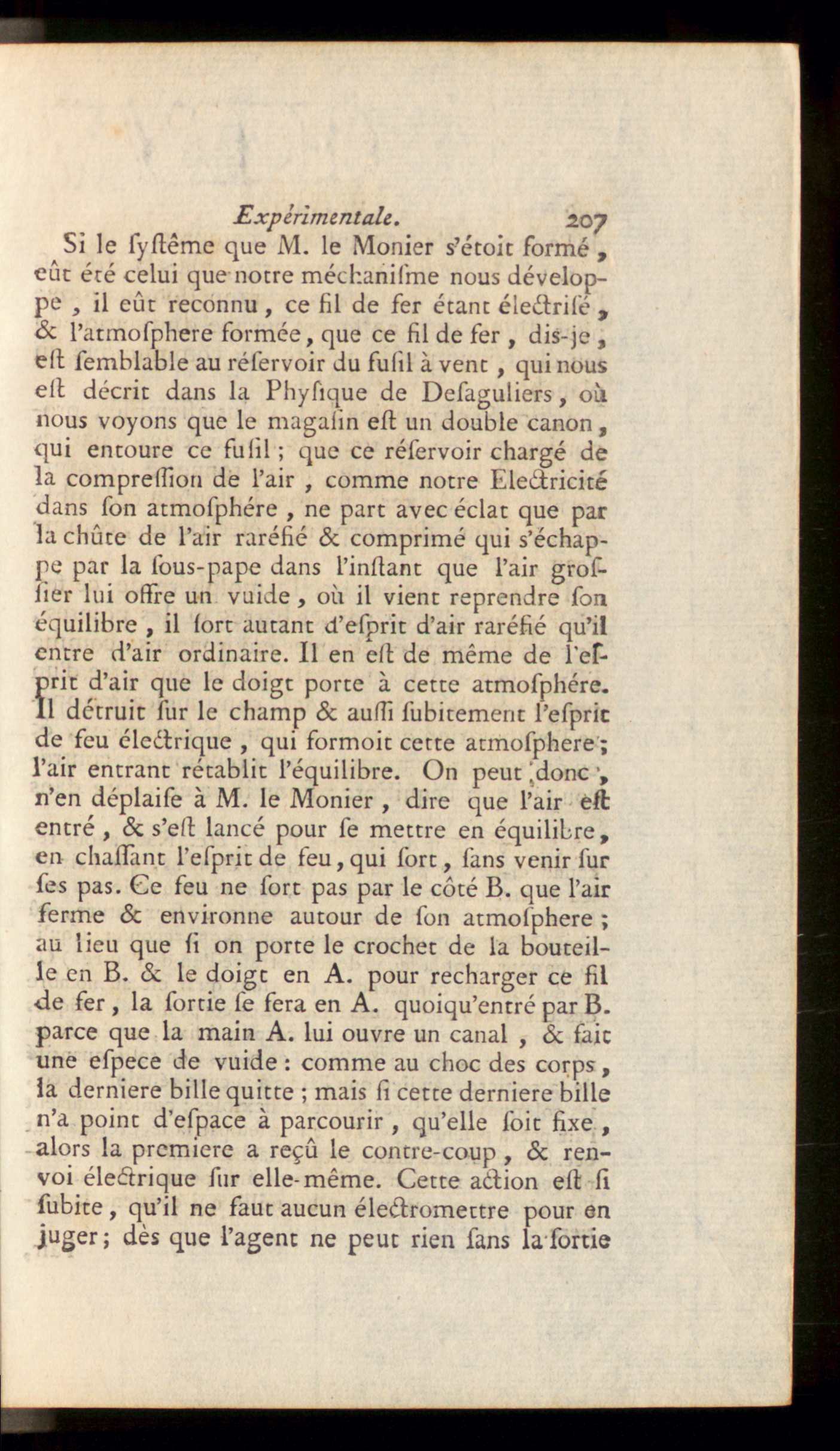 Si le système que M. le Monier s’étoit formé ,eût été celui que notre méchanifme nous dévelop-pe , il eût reconnu , ce fil de fer étant électrifé ,<5c l’atmofphere formée, que ce fil de fer , dis-je ,est semblable au réservoir du fufil à vent , qui nousest décrit dans la Physique de Desaguliers, oùnous voyons que le magasin est un double canon ,qui entoure ce fusil ; que ce réservoir chargé dela compression de l’air , comme notre Electricitédans son atmosphère , ne part avec éclat que parla chûte de l’air raréfié & comprimé qui s’échap-pe par la sous-pape dans l’instant que l’air gros-sier lui offre un vuide, où il vient reprendre sonéquilibre , il sort autant cf esprit d’air raréfié qu’ilentre d’air ordinaire. II en est de même de ï'ef-