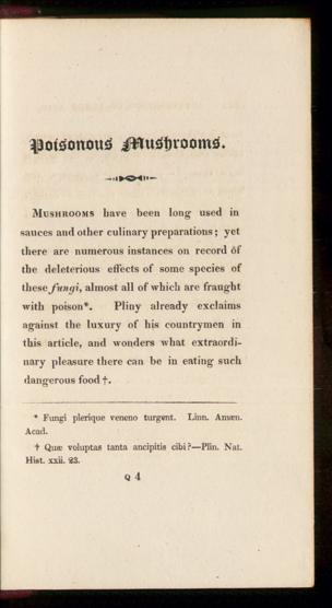Mushrooms have been long used insauces and other culinary preparations; yetthere are numerous instances on record 6fthe deleterious effects of some species ofthese fungi, almost all of which are fraughtwith poison*. Pliny already exclaimsagainst the luxury of his countrymen inthis article, and wonders what extraordi-nary pleasure there can be in eating suchdangerous food f.