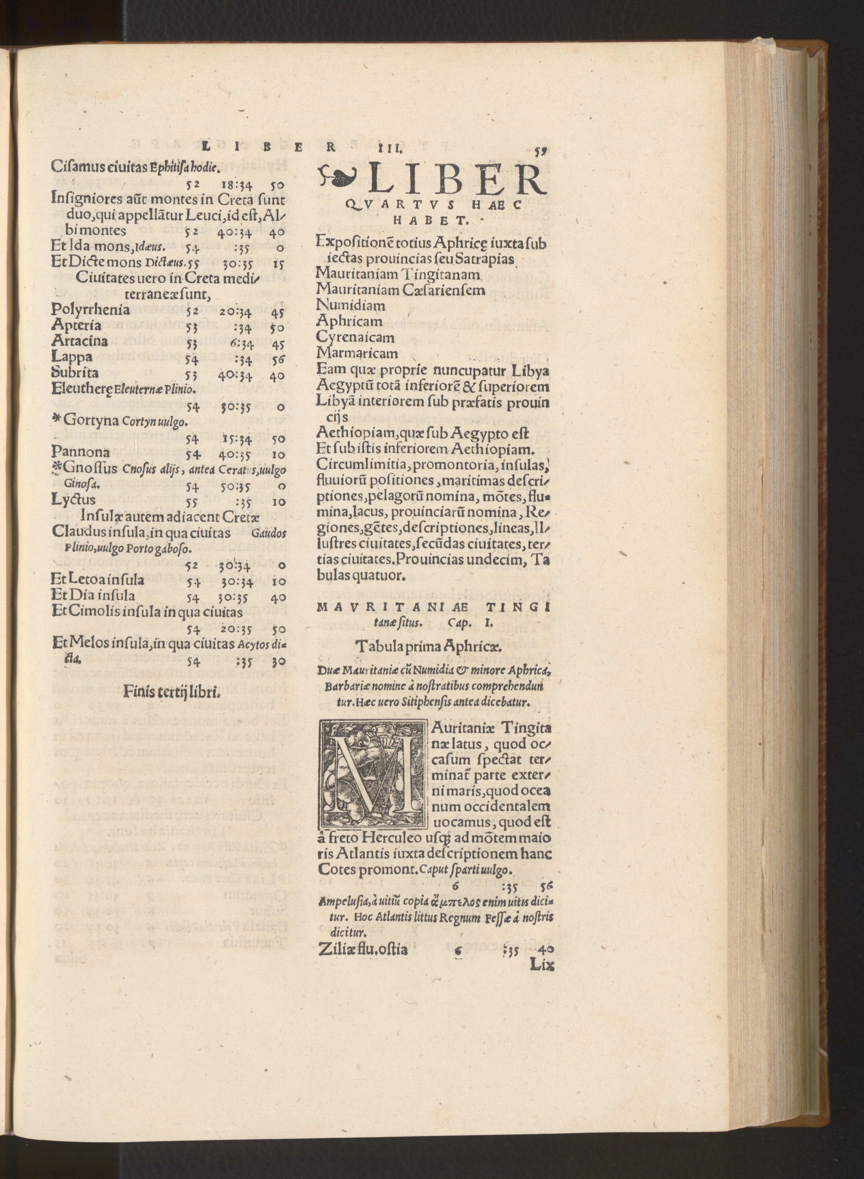 Expoſitionẽ totius Aphricę iuxta ſubiectas prouincias ſeu SatrapiasMauritaniam I ingitanamMauritaniam CæſarienſemNumidiamAphricamCyrenaicamMarmaricam 4 lenEam quæ proprie nuncupatur LibyaAegyptũ totã inferiorẽ& ſuperioremLibyã interiorem ſub præfatis prouincijsAethiopiam, quæ ſub Aegypto eſtEt ſub iſtis inferiorem Aethiopiam.Circumlimitia, promontoria, inſulas,fluuiorũ poſitiones, maritimas deſcri-ptiones, pelagorũ nomina, mõtes, flu-mina, lacus, prouinciarũ nomina, Re-giones, gẽtes, deſcriptiones, lineas, Il/ſuſtres ciuitates, ſecũdas ciuitates, ter/tias ciuitates. Prouincias undecim, Tabulas quatuor.