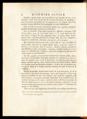 Calendrier signifie donc mot à mot Tableau des Calendes ou des Lunesde Vannée. Mais d’où vint le mot de Calendes lui-même, & pourquoi cenom sut-il donné au premier jour de chaque mois ì car jusques alors 1 éty-mologie du mot Calendrier fera incomplette & moins latisfaiiante.