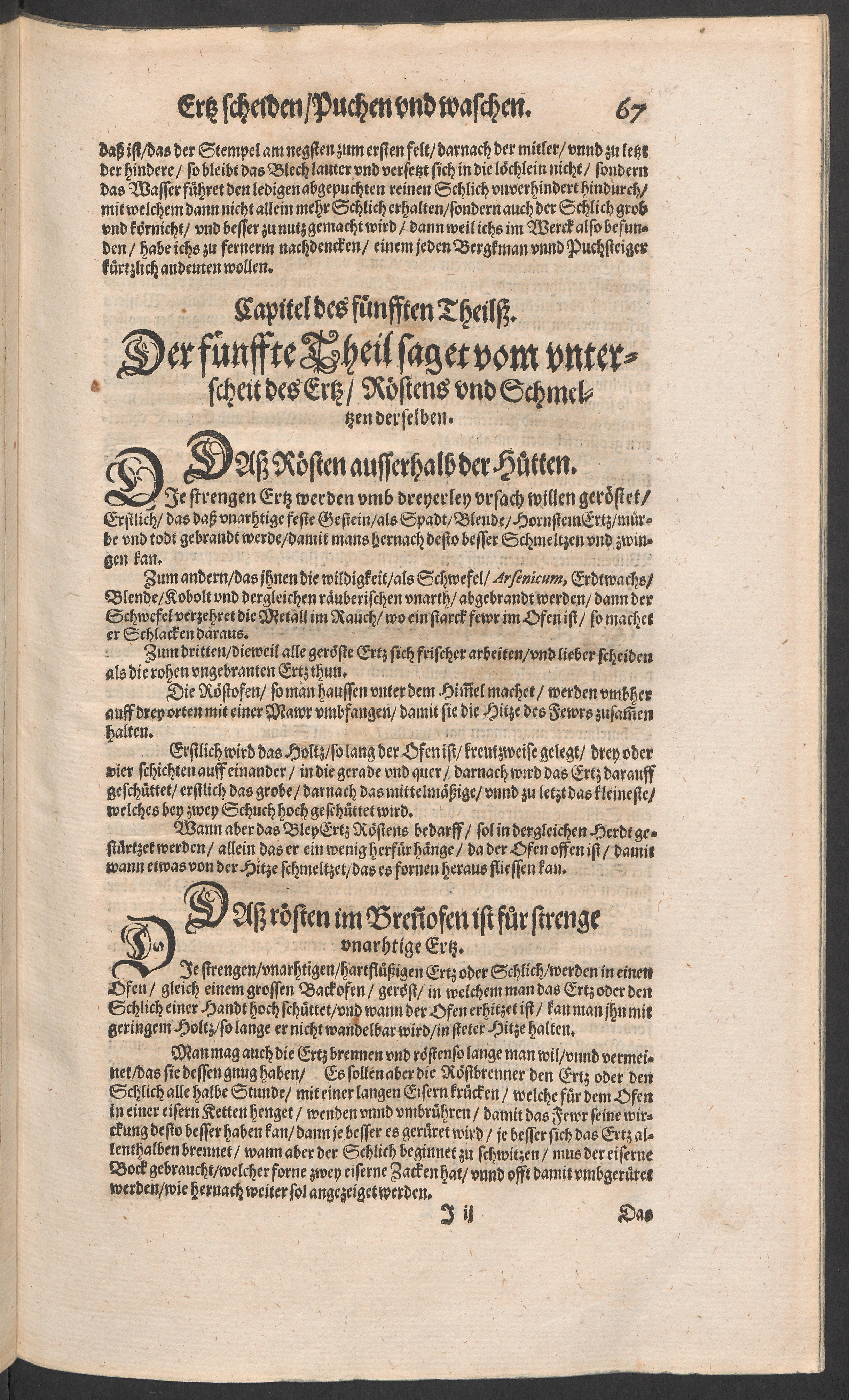 Ertz scheiden/ Puchen vnd waschen.67daß ist/ das der Stempel am negsten zum ersten felt/ darnach der mitler/ vnnd zu letztder hindere, so bleibt das Blech lauter vnd versetzt sich in die löchlein nicht, sonderndas Wasser führet den ledigen abgepuchten reinen Schlich vnverhindert hindurchmit welchem dann nicht allein mehr Schlich erhalten, sondern auch der Schlich grobvnd körnicht, vnd besser zu nutz gemacht wird, dann weil ichs im Werck also befun-den/ habe ichs zu fernerm nachdencken, einem jeden Bergkman vnnd Puchsteigertuertzlich andeuten wollen.Capitel des fünfften Theilß.Der funffte Theil saget vom vnter-scheit des Ertz/Röstens vnd Schmel-tzen derselben.Daß Rösten ausserhalb der Hütten.Je strengen Ertz werden vmb dreyerley vrsach willen geröstet,Erstlich, das daß vnarhtige feste Gestein, als Spadt, Blende, Hornstein Ertz, mür-be vnd todt gebrandt werde/ damit mans hernach desto besser Schmeltzen vnd zwin-gen kan.Zum andern, das ihnen die wildigkeit, als Schwefel/ Arsenicum, Erdtwachs/Blende/ Kobolt vnd dergleichen räuberischen vnarth/ abgebrandt werden/ dann derSchwefel verzehret die Metall im Rauch, wo ein starck fewr im Ofen ist, so macheter Schlacken daraus.Zum dritten, dieweil alle geröste Ertz sich frischer arbeiten, vnd lieber scheidenzthun.als die rohen vngebranten EDie Röstofen, so man haussen vnter dem Himmel machet, werden vmbherauff drey orten mit einer Maur vmbfangen, damit sie die Hitze des Fewrs zusamenhalten.Erstlich wird das Holtz/ so lang der Ofen ist/ kreutzweise gelegt/ drey odervier schichten auff einander, in die gerade vnd quer, darnach wird das Ertz darauffgeschüttet, erstlich das grobe, darnach das mittelmäßige, vnnd zu letzt das kleineste,welches bey zwey Schuch hoch geschuͤttet wird.Wann aber das Bley Ertz Röstens bedarff/ sol in dergleichen Herdt ge-stürtzet werden, allein das er ein wenig herfürhänge, da der Ofen offen ist, damitwann etwas von der Hitze schmeltzet/ das es fornen heraus fliessen kan.DAß roͤsten im Brennofen ist fuͤr strengevnarhtige Ertz.SJe strengen vnarhtigen/ hartfluͤßigen Ertz oder Sehlich/ werden in einenOfen gleich einem grossen Backofen, geröst, in welchem man das Ertz oder denSchlich einer Handt hoch schüttet, vnd wann der Ofen erhitzet ist, kan man ihn mitgeringem Holtz/ so lange er nicht wandelbar wird/ in steter Hitze halten.Man mag auch die Ertz brennen vnd röstenso lange man wil/ vnnd vermei-net/ das sie dessen gnug haben, Es sollen aber die Röstbrenner den Ertz oder denSchlich alle halbe Stunde, mit einer langen Eisern krücken, welche für dem Ofenin einer eisern Ketten henget, wenden vnnd vmbrühren, damit das Fewr seine wir-ckung desto besser haben kan, dann je bessr es gerüret wird, je busser sich das Ertz al-lenthalben brennet, wann aber der Schlich beginnet zu schwitzen, mus der eiserneBock gebraucht, welcher forne zwey eiserne Zacken hat, vnnd offt damit vmbgerüretwerden/ wie hernach weiter sol angezeiget werden.Das3 ij