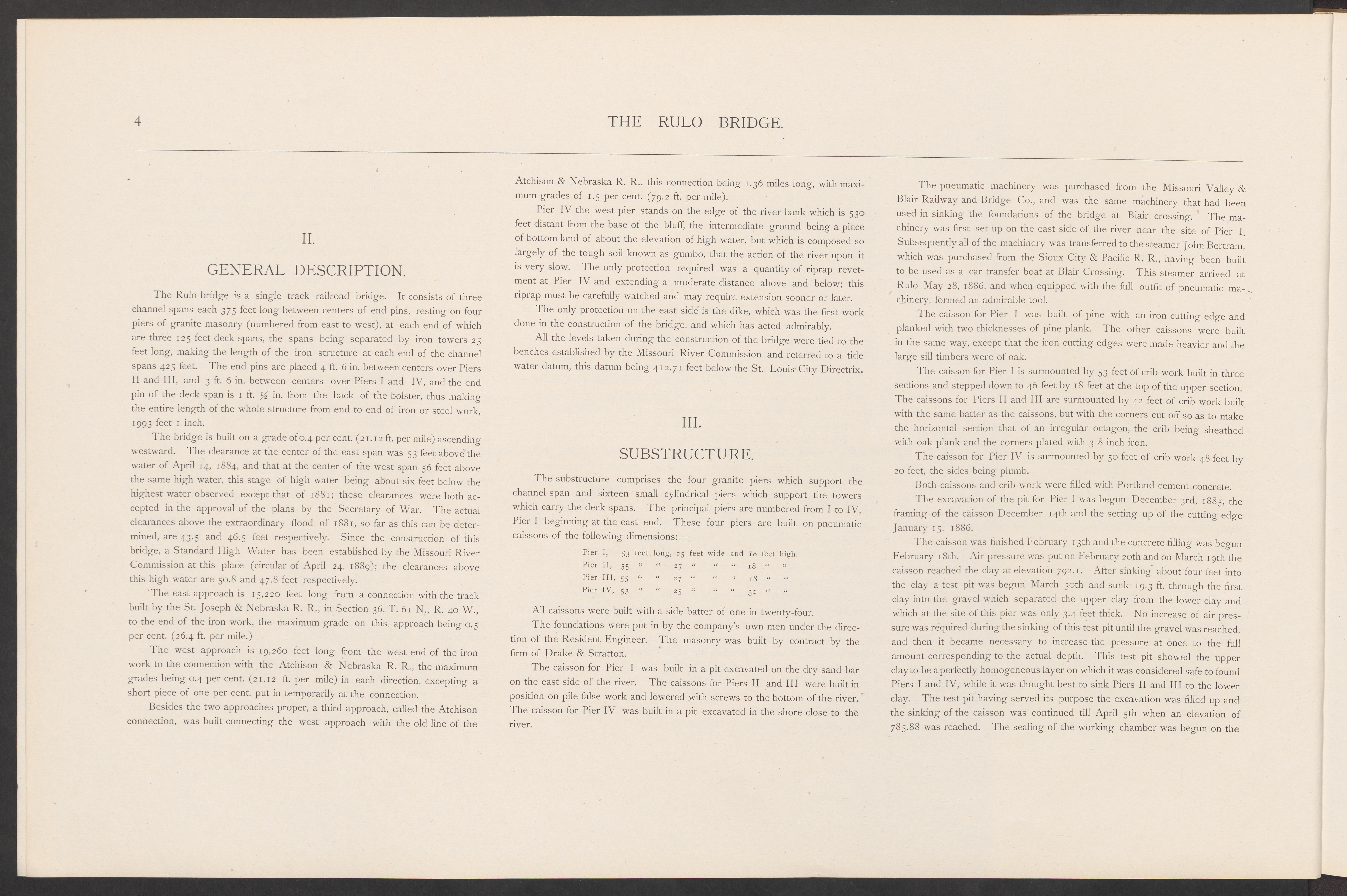 The Rulo bridge is a single track railroad bridge. It consists of threechannel spans each 375 feet long between centers of end pins, resting on fourpiers of granite masonry (numbered from east to west), at each end of whichare three 125 feet deck spans, the spans being separated by iron towers 25feet long, making the length of the iron structure at each end of the channelspans 425 feet. The end pins are placed 4 ft. 6 in. between centers over Piers II and III , and 3 ft. 6 in. between centers over Piers I and IV , and the endpin of the deck span is 1 ft. in. from the back of the bolster, thus makingthe entire length of the whole structure from end to end of iron or steel work,1993 feet 1 inch.
