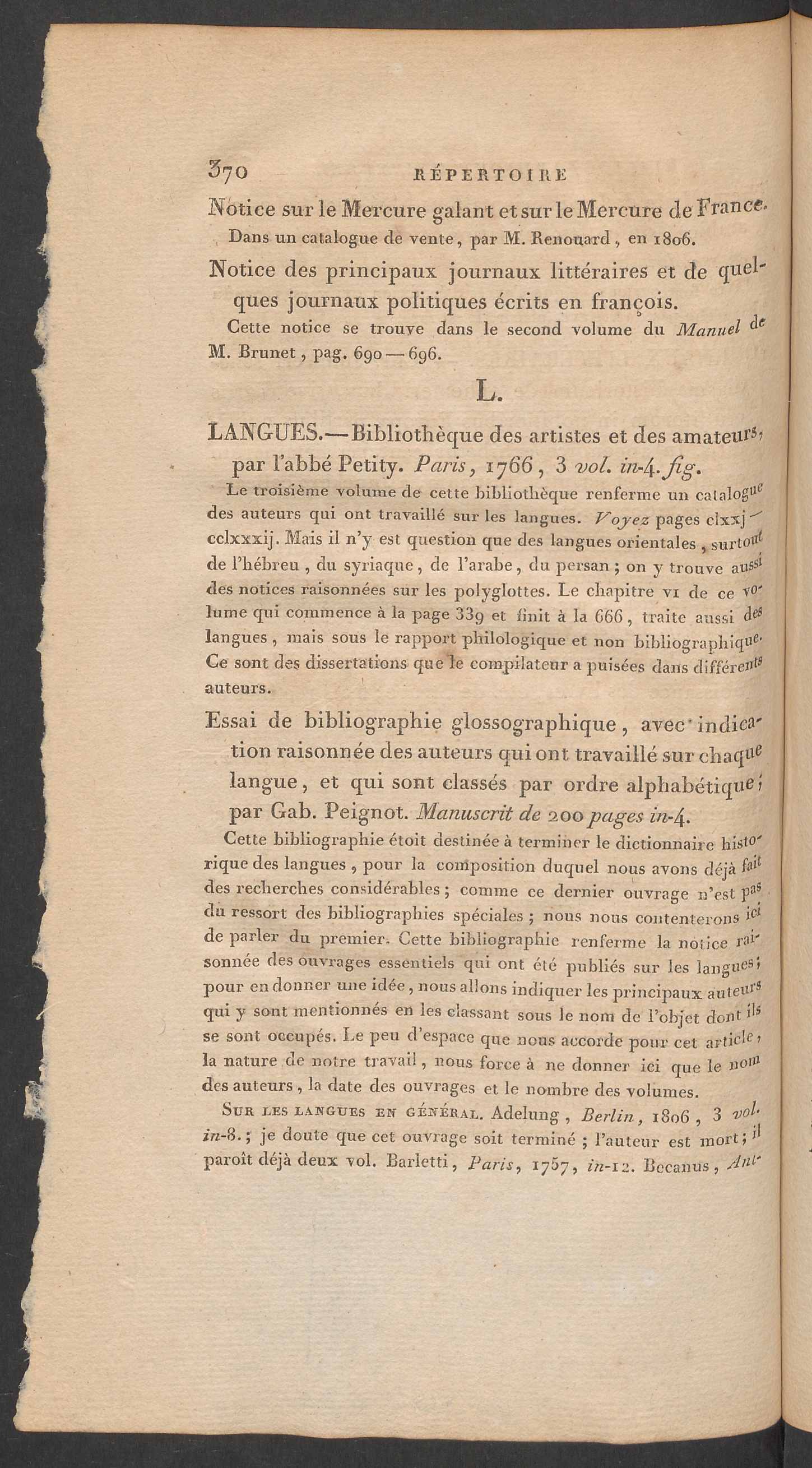 Cette bibliographie étoit destinée à terminer le dictionnaire his* 0 *rique des langues , pour la cowlposition duquel nous avons déjà fr 1 *des recherches considérables ; comme ce dernier ouvrage n’estdu ressort des bibliographies spéciales ; nous nous contenterons lClde parler du premier. Cette bibliographie renferme la notice J'® 11-sonnée des ouvrages essentiels qui ont été publiés sur les lang« eS ’pour en donner une idée, nous allons indiquer les principaux auie 11 * 3qui y sont mentionnés en les classant sous le nom de l’objet dont >' 9se sont occupés. Le peu d’espace que nous accorde pour cet artie^’