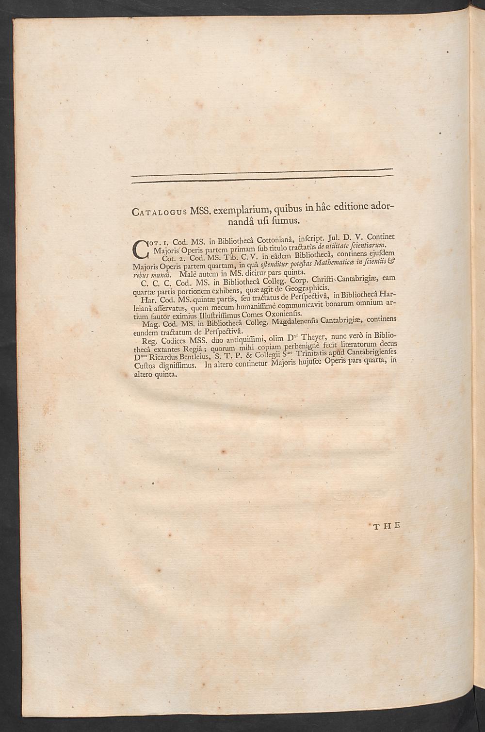 C ot. i. Cod. MS. in Bibliotheca Cottonianä, inscript. Jul. D. V. ContinetMajoris Operis partem primam sub titulo tractatus de utilitate scientiarum.Cot. 2. Cod. MS. Tib. C. V. in eadem Bibliotheca, continens ejusdemMajoris Operis partem quartam, in qua ostenditur potestas Mathematica in scientiis &rebus mundi. Male autem in MS. dicitur pars quinta.