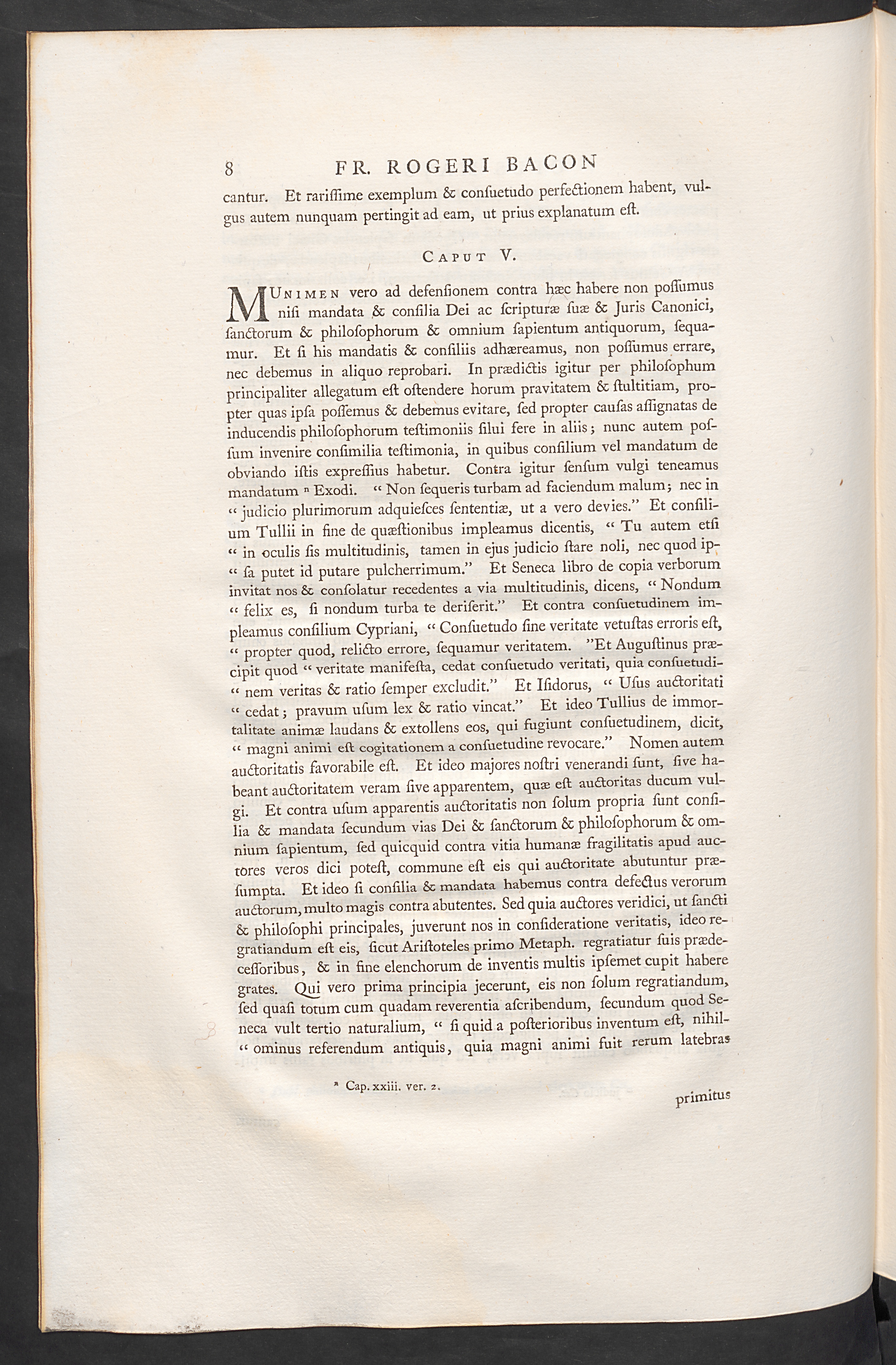 jLV-A. uisi mandata ,& consilia Dei ac scripturas suas & Juris Canonici,sanctorum & philosophorum & omnium sapientum antiquorum, sequa-mur. Et si his mandatis & consiliis adhaereamus, non possumus errare,nec debemus in aliquo reprobari. In prodictis igitur per philosophumprincipaliter allegatum est ostendere horum pravitatem & stultitiam, pro-pter quas ipsa possemus & debemus evitare, sed propter causas assignatas deinducendis philosophorum testimoniis silui fere in aliis; nunc autem pos-sum invenire consimilia testimonia, in quibus consilium vel mandatum deobviando istis expressius habetur. Contra igitur sensum vulgi teneamusmandatum n Exodi. " Non sequeris turbam ad faciendum malum; nec in" judicio plurimorum adquiesces sententiae, ut a vero devies.” Et consili-um Tullii in fine de questionibus impleamus dicentis, " Tu autem etsi" in oculis sis multitudinis, tamen in ejus judicio stare noli, nec quod ip-“ sa putet id putare pulcherrimum.” Et Seneca libro de copia verboruminvitat nos & consolatur recedentes a via multitudinis, dicens, " Nondum" felix es, si nondum turba te deriserit.” Et contra consuetudinem im-pleamus consilium Cypriani, " Consuetudo sine veritate vetustas erroris est," propter quod, relicto errore, sequamur veritatem. "Et Augustinus prae-cipit quod " veritate manifesta, cedat consuetudo veritati, quia consuetudi-" nem veritas & ratio semper excludit.” Et Isidorus, " Usus auctoritati" cedat; pravum usum lex & ratio vincat.” Et ideo Tullius de immor-talitate animas laudans & extollens eos, qui fugiunt consuetudinem, dicit," magni animi est cogitationem a consuetudine revocare.” Nomen autemauctoritatis favorabile est. Et ideo majores nostri venerandi sunt, sive ha-beant auctoritatem veram sive apparentem, quo est auctoritas ducum vul-gi. Et contra usum apparentis auctoritatis non solum propria siint consi-lia & mandata secundum vias Dei &C sanctorum & philosophorum & om-nium sapientum, sed quicquid contra vitia humanas fragilitatis apud auc-tores veros dici potest, commune est eis qui auctoritate abutuntur prae-sumpta. Et ideo si consilia & mandata habemus contra defectus verorumauctorum, multo magis contra abutentes. Sed quia auctores veridici, ut sancti& philosophi principales, juverunt nos in consideratione veritatis, ideo re-gradandum est eis, sicut Aristoteles primo Metaph. regradatur silis prode-cessoribus , & in fine elenchorum de inventis multis ipsemet cupit haberegrates. Qui vero prima principia jecerunt, eis non solum regradandum»sed quasi totum cum quadam reverentia ascribendum, secundum quod Se-neca vult tertio naturalium, " si quid a posterioribus inventum est, nihil-" ominus referendum antiquis, quia magni animi fuit rerum latebras