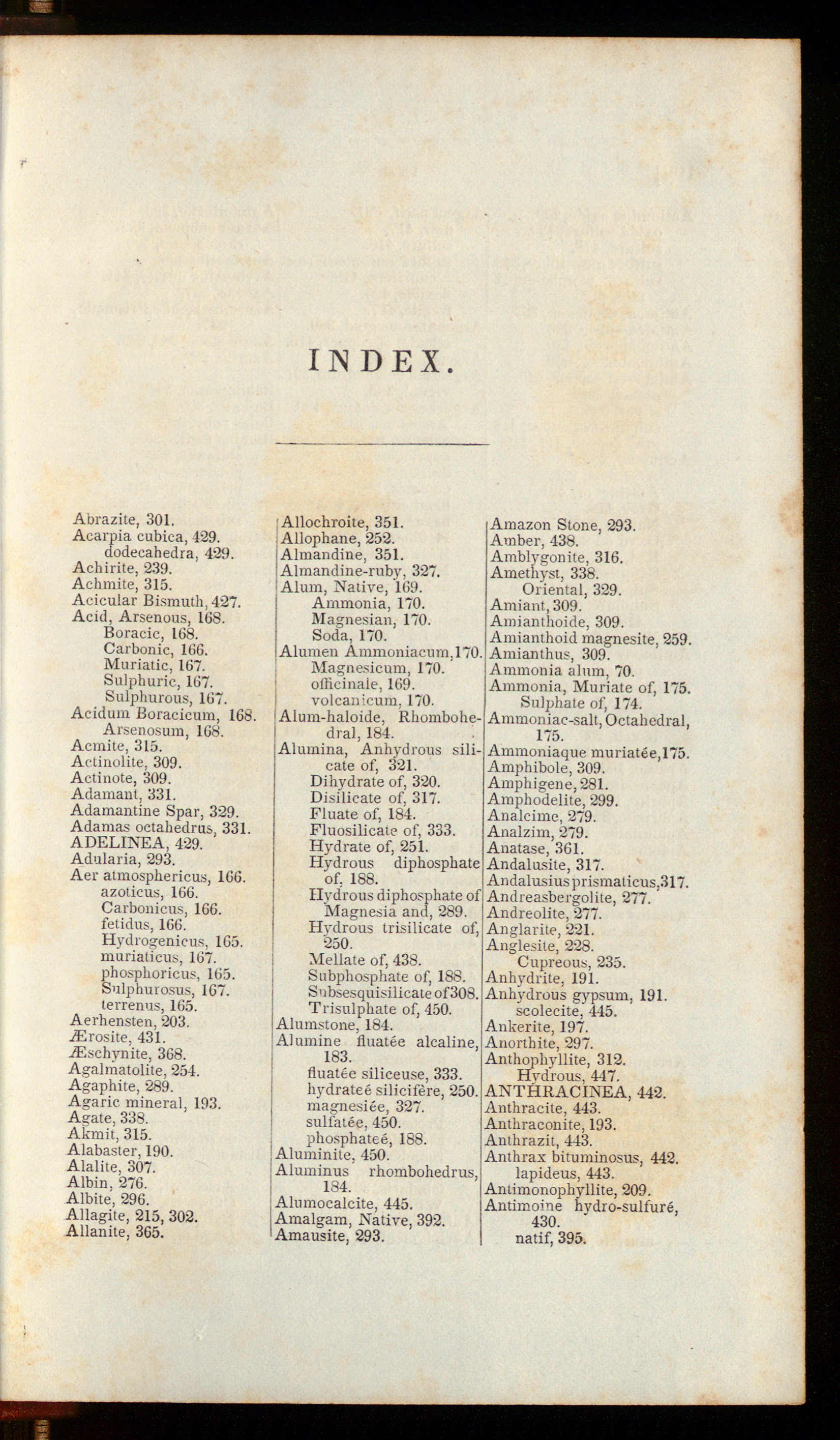 Ammoniaque muriatee,175.Amphibole, 309.Amphigene,281.Amphodelite, 299.Analcime, 279.