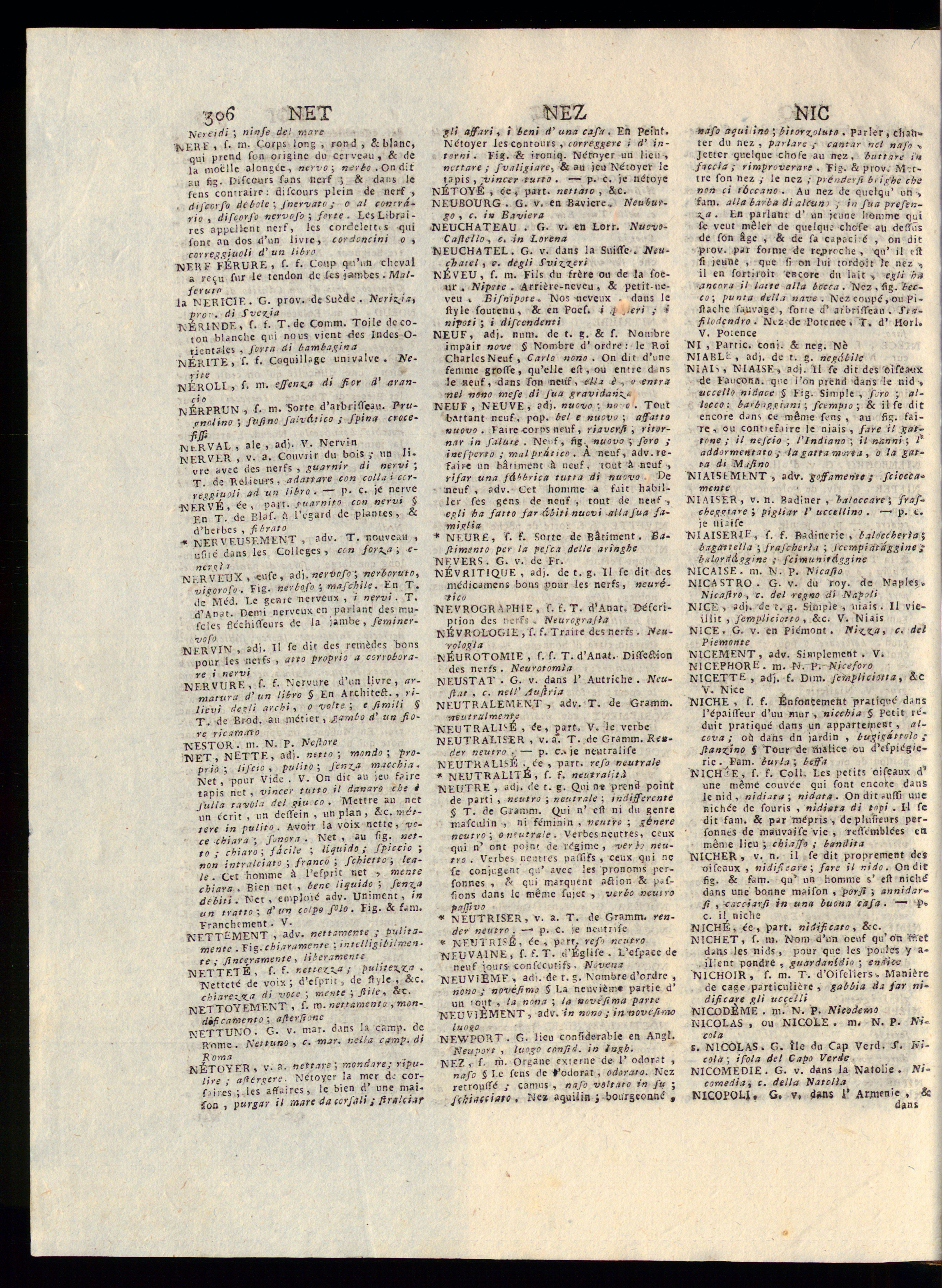 NETTEMENT , adv. nettamente ; pulita-mente .Fig. chiaramente : inttlligibi/men •te; finceramente > liberamenteNETTETÉ, f. f. rettela; pulitela .Netteté de voix; d'efprst, de ftyle , &c.chiarezza di voce ; mente ; fitte, Sec.NETTOYEMENT , f. m. nettamento » mon-difi camentoafierfioneNETTUNO. G. v. mar. dans la camp, deRome . Nettuno , c. mar. nella camp, diR orna