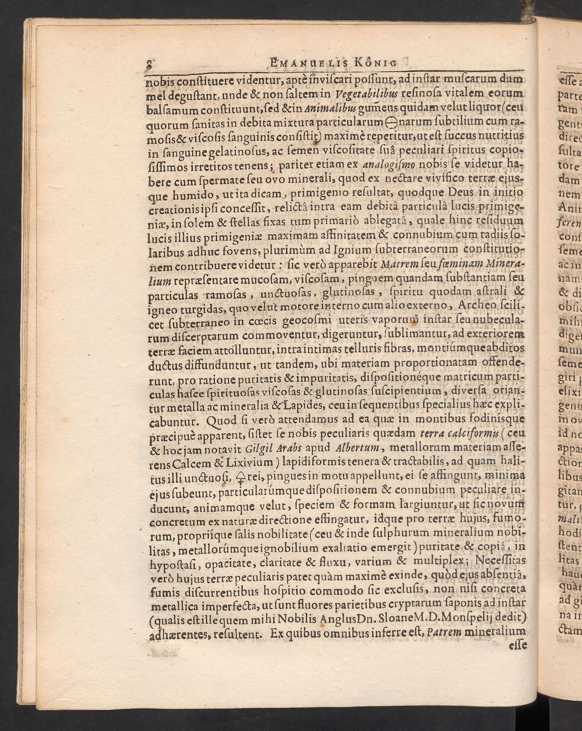 nobis constituere videntur, apte invifeari poliunt, ad instar muscarum dummei degustant,- unde & non saltem in Vegetabilibus resinosa vitalem eorumbalsamum constituunt,sed&inA»imA/i£*tfgutheus quidam velut liquor(ceuquorum sanitasin debna mixtura particularum Qnarum subtilium cum ra-mosis&viscosis sanguinis consistijpmaximereperitur,utest succus nutritiusin fanguinegelatinosus, ac femen viscositate fise peculiari spiritus copio.siffimos irretitos tenens; pariter etiam ex analogifmo nobis fe videtur ha?bere cum fpermate seu ovo minerali, quod ex nectare vivifico terra: ejus-que humido, utitadicam, primigenio resultat, quodque Deus in initiocreationisipsiconcessit, relictä intra eam debita particula lucis primige-nia:, insolem & stellas fixas tum primario ablegata, quale hinc residuumlucis illius primigenia: maximam affinitatem & connubiumcum radiis so-laribus adhuc fovens, plurimum ad Ignium subterraneorum constitutio-nem contribuere videtur : sic vero apparebit Matrem ka fceminam Minera-lium repraesentare mucosam, viscosam, pinguem quandam substantiam seuparticulas ramosas , unctuosas, glutinöses , spiritu quodam astrali &igneo turgidas, quo velnt motore interno cum alio externo, Archeo Icili,cet subterraneo in ccecis geocosmi uteris vaporam instar seunubecula-rumdiscerptarum commoventur, digeruntur, sublimantur, ad exterioremterrte faciem attollantur, intraintimas telluris fibras, montiumqueabditosductus diffunduntur, ut tandem, ubi materiam proportionatam offende-runt, pro ratione puritatis Lc impuritatis, difpositioneque matricum parti-culas hafce fpirituoses viscosas &glutinoses suscipientium » diverse orian-tur metalla ac mineralia &T,apides, ceu in sequentibus specialius hate expli-cabuntur. Quod si vero attendamus ad ea quae in montibus fodimsquepraecipue apparent, sistet fe nobis peculiaris quaedam terra calci formis (ceuLc hoc jam notavit Gilgil Arabs apud Albertum , metallorum materiam affe-rens Calcem 8i Lixivium) lapidiformistenera&■tractabilis,ad quam hali-tus illi unctuoA, <^rei> pingues in motu appellunt, ei fe affingunt, minimaejussubeunt,particularumquedifposirionem & conmibium peculiare in-ducunt, animamque velut, speciem & formam largiuntur, ut sic novumconcretum ex natura directione effingatur, idque pro terrae hujus, furno-rum,propriique falisnobilitatefceu&inde sulphurum mineralium nobi-litas, metallorumqueignobilium exaltatio emergit)puritate & copiä, inhypostasi, opacitate, claritate & fluxu, varium & multiplex; Neceffitasverb hujus terrae peculiaris patet qu^m maxime exinde, qubd ejus absentia»fumis discurrentibus hospitio commodo sic exclusis, non nisi concretametallica impetfecta,utsuntfluores parietibus cryptarum seponis ad instar(qualis estillequem mihi Nobilis AnglusDn. SloaneM.D.Monlpelij dedit)adhasrentes» resultent. Ex quibus omnibus inferre est, Patrem mineralium