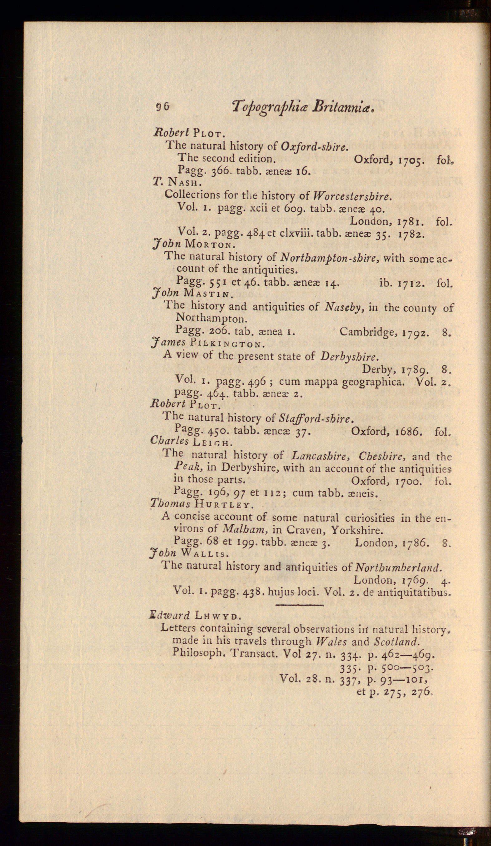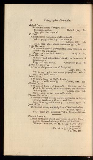 The natural history of Lancashire, Cheshire, and thePeak, in Derbyshire, with an account of the antiquitiesin those parts. Oxford, 1700. fol.