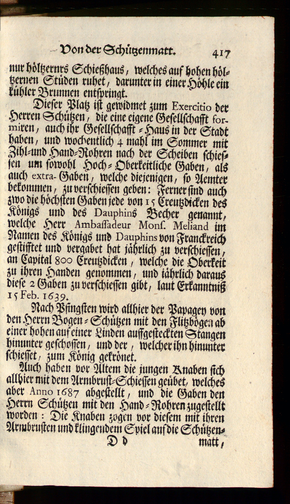 Dieser Platz ist gewidmet zum Lxercino derHerren Schützen, die eine eigene Gesellschafft lor.miren, auch ihr Gesellschafft - Haus in der Stadthaben, und wöchentlich 4 mahl im Sommer mitZthl-und Hand-Rohren nach der Scheiben schiel-ten um sowohl Hoch-Oberkeitliche Gaben, alsauch exrra. Gaben, welche diejenigen, so Aemterbekommen, zu verschießen geben: Ferner sind auchzwo die höchsten Gaben jede von 15 Creutzdicken desKönigs und des Dauphins Becher gmannt,welche Herr Hrnkägääeur irions. NLiianä imNamen des Königs und vguvbinxvonFranckreichgestifftet und vergäbet hat jährlich zu verschießen,an Capital 822 Creutzdicken, welche die Oberkeitzu ihren Handen genommen, und jährlich darausdiese 2 Gaben zuverschiessen gibt, laut Erkanntniß