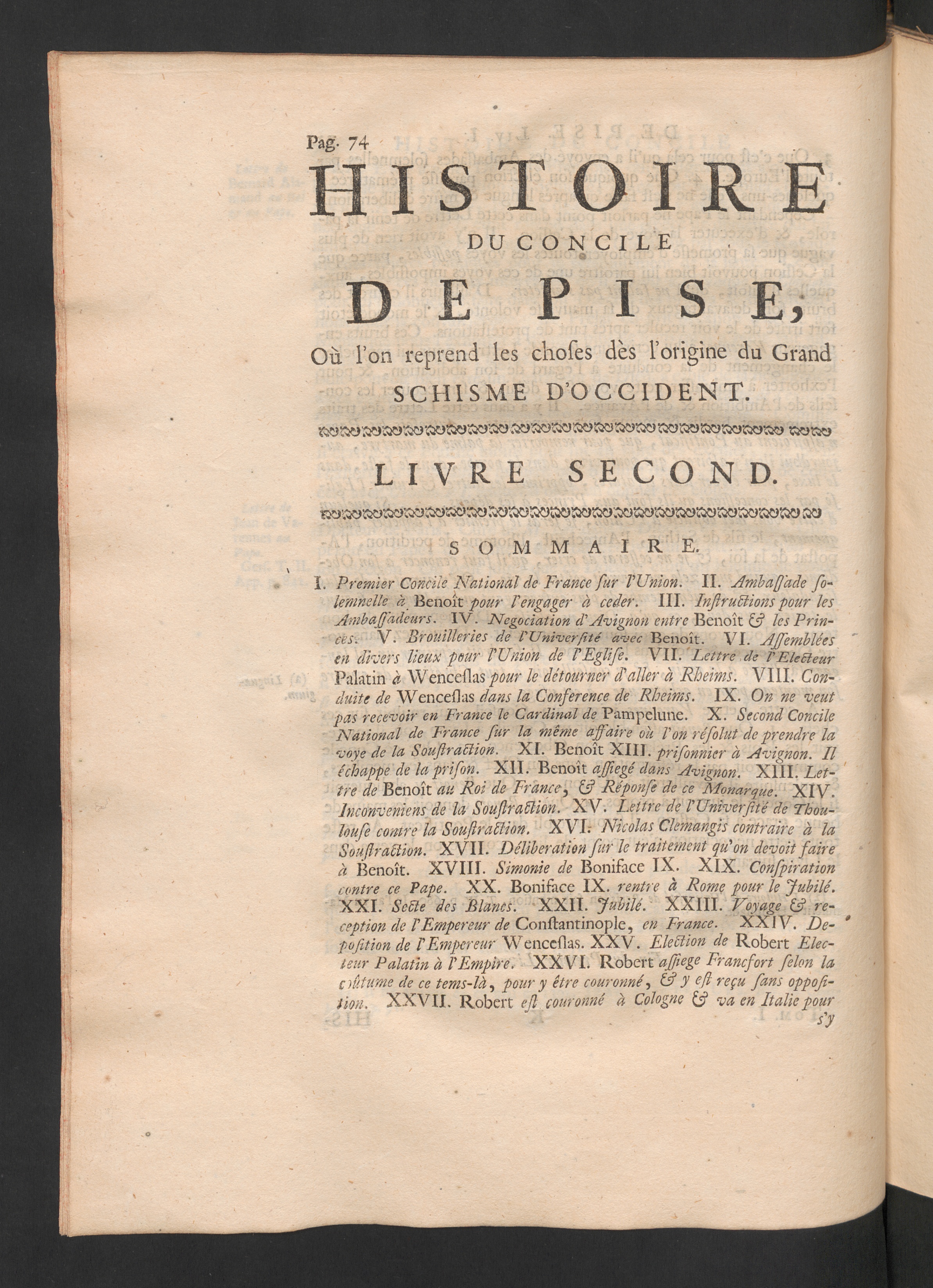 I. Premier Concile National de France fur VUnion. II. Ambassade so-lennelle a Benoît pour T engager à ceder. III. Instructions pour lesAmbaffadcurs. IV. Négociation d'Avignon entre Benoît íi? les Prin-ces. V. Brouilleries de P Université avec Benoît. VI. Assembléesen divers lieux peur TUnion de V Eglise . VII. Lettre de r ElecteurPalatin d Wenceslas pour le détourner (daller à Rheims. VIII. Con-duite de Wenceslas dans la Conférence de Rheims. IX. On ne veut■pas recevoir en France le Cardinal de Pampelune. X. Second ConcileNational de France fur la même affaire oìi l'on résolut de prendre lavoye de la Soustraction. XI. Benoit XIII. prisonnier à Avignon. IIéchappe de la prison. XII. Benoît assiégé dans Avignon. XIII. Let-tre de Benoît ait Roi de France, & Réponse de ce Monarque. XIV.lnconveniens de la Soustraction. XV. Lettre de l'Unìverstté de Thou-loufe contre la Soustraction. XVI.- Nicolas Clemangis contraire à laSoustraction. XVII. Délibération fur le traitement qu'on devoit faireà Benoît. XVIII. Simonie de Boniface IX. XIX. Conspirationcontre ce Pape. XX. Boniface IX. rentre à Rome pour le Jubilé.XXI. Secte des Blancs. XXII. Jubilé. XXIII. Voyage & ré-ception de T Empereur de Constantinople, en France. XXIV. De- *position de l'Empereur Wenceslas. XXV. Election de Robert Elec-teur Palatin à VEmpire. XXVI. Robert affiege Francfort selon lac lût lime de ce tems-là , pour y être couronnés & y est reçu fans opposi-tion. XXVII. Robert est couronné à Cologne (F va en Italie pour
