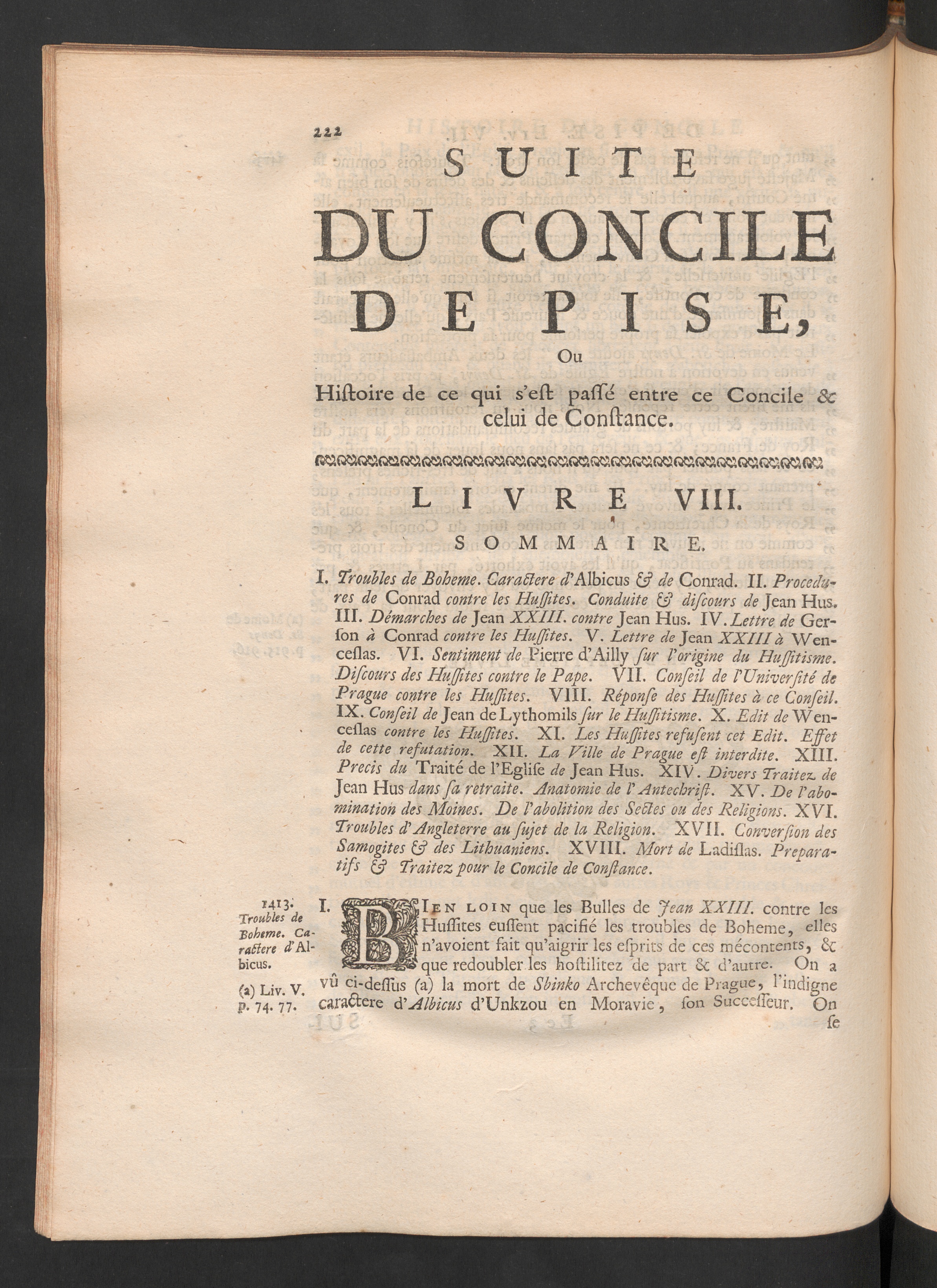I. Troubles de Boheme. Caraclere J’Albicus &? de Conrad. II. Procédu-res de Conrad contre les Huffites. Conduite & discours de Jean Hus.III. Démarches de Jean XXIII. contre Jean Hus. W .Lettre de Ger-son à Conrad contre les Huffites. V. Lettre de Jean XXIII à Wen-ceslas. VI. Sentiment de Pierre d’Ailly fur ! origine du Huffitisme.Discours des Huffites contre le Pape. VII. Conseil de l'Univerfiité dePrague contre les Huffites. VIII. Réponse des Huffites à ce Conseil.IX. Conseil de Jean deLythomils fur le Huffitisme. X. Edit de Wen-ceilas contre les Huffites. XI. Les Huffites refusent cet Edit. Effetde cette réfutation. XII. La Hille de Prague efl interdite. XIII.Précis du Traité de l’Eglsse de Jean Hus. XIV. Divers Traitez, deJean Hus dans fa retraite. Anatomie de l'Antéchrist. XV. De r abo-mination des Moines. De Vabolition des Selles ou des Religions. XVI.Troubles d'Angleterre au sujet de la Religion. XVII. Conversion desSamogites & des Lithuaniens. XVIII. Mort de Ladiílas. Prépara-tifs £5? Traitez pour le Concile de Constance.