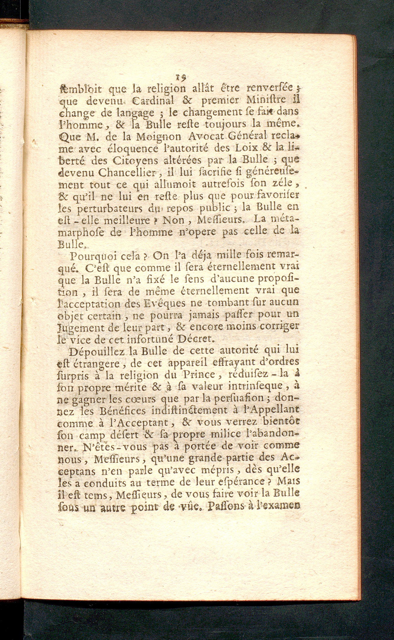 fembï'oit que la religion allât être renversée }que devenu. Cardinal & premier Ministre ilchange de langage ; le changement se fart-dansrhomme > Le la Bulle reste toujours la même.Que M. de la Moignon Avocat Général recla+me avec éloquence l’autorité des Loix 8c la li-berté. des Citoyens altérées par la Bulle 5 quedevenu Chancellier, il lui sacrifie si généreuse-ment tout ce qui allumoit autrefois son zélé,& qu’il ne lui en reste, plus que pour favoriserles perturbateurs du> repos public ; la Bulle enest - elle meilleure ì Non , Messieurs.. La méta-marphose de l’homme ffopere pas celle de laBulle.