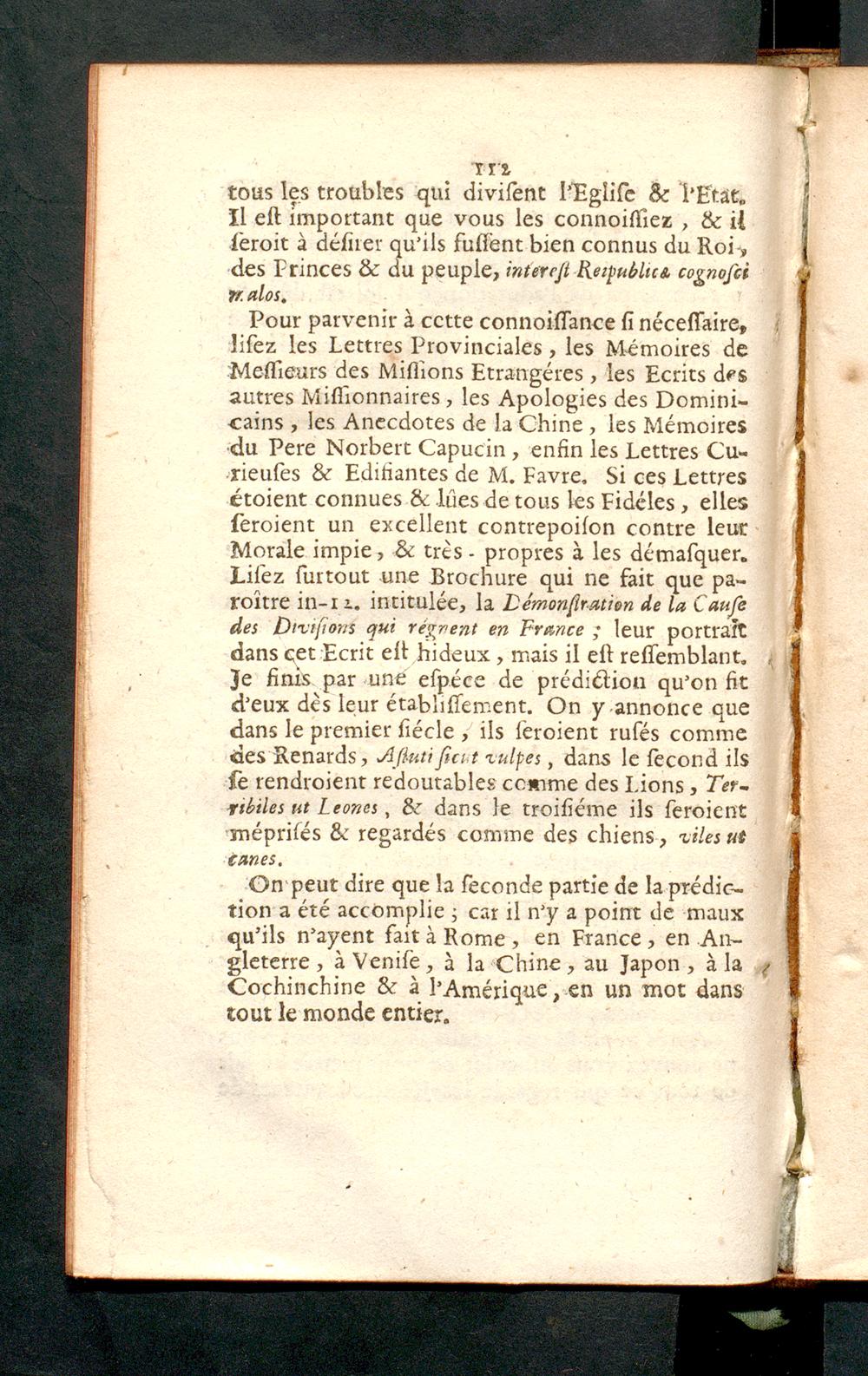 Pour parvenir à cette connoissance fi nécessaire, flisez les Lettres Provinciales , les Mémoires deMessieurs des Missions Etrangères, les Ecrits desautres Missionnaires, les Apologies des Domini-cains , les Anecdotes de la Chine , les Mémoiresdu Pere Norbert Capucin , enfin les Lettres Cu-rieuses & Edifiantes de M. Favre. Si ces Lettresétoient connues Sc lûes de tous les Fidèles, ellesseroient un excellent contrepoison contre leurMorale impie, & très - propres à les démasquer.Lisez surtout une Brochure qui ne fait que pa-roître in-i 1 . intitulée, la Démonstration de la Causedes Divisons qui règnent en France ; leur portraitdans cet Ecrit est hideux, mais il est ressemblant. <Je finis par une espèce de prédiction qu’on fitd'eux dès leur établissement. On y annonce quedans le premier siécle , ils seroient rusés commedes Renards, Jiflutificut zulpes , dans le fécond ilsse rendroient redoutables comme des Lions, Ter-itbiles ut Leones , 8r dans le troisième ils seroientméprisés 8c regardés comme des chiens , viles uttanes.