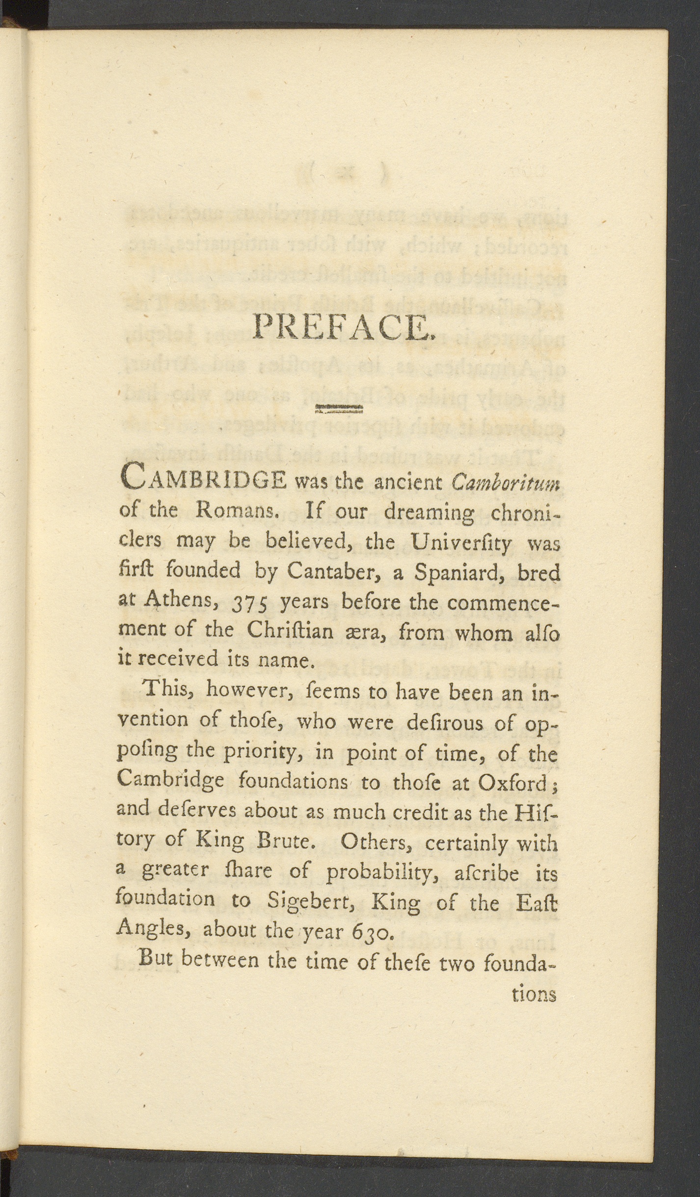 CAMBRIDGE was the ancient Camboritumof the Romans. If our dreaming chroni-clers may be believed, the Univerfity wasfirft founded by Cantaber, a Spaniard, bredat Athens, 375 years before the commence-ment of the Chriftian sera, from whom alfoit received its name.