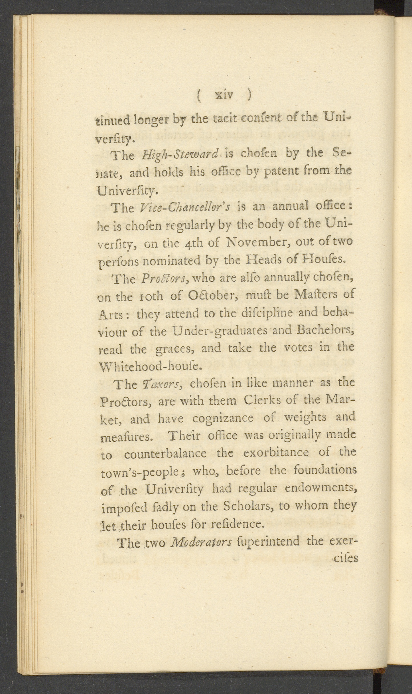 The ‘Taxors, chofen in like manner as theProdtors, are with them Clerks of the Mar-ket, and have cognizance of weights andmeafures. Their office was originally madeto counterbalance the exorbitance of thetown’s-peoplewho, before the foundationsof the Univerfity had regular endowments,impofed fadly on the Scholars, to whom they,let their houfes for refidence.