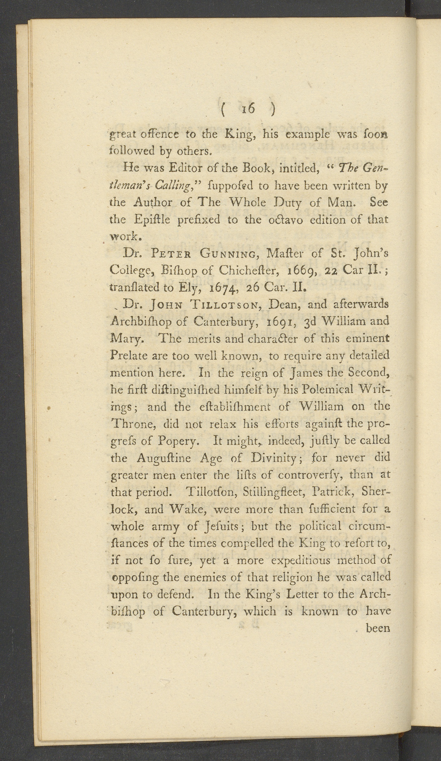 . Dr. John Tillotson , Dean, and afterwardsArchbifhop of Canterbury, 1691, 3d William and Mary . The merits and character of this eminentPrelate are too well known, to require any detailedmention here. In the reign of James the Second,he firft diftinguifhed himfelf by his Polemical Writ-ings; and the eftablifhment of William on theThrone, did not relax his efforts againft the prc-grefs of Popery. It might, indeed, jufUy be calledthe Auguftine Age of Divinity; for never didgreater men enter the lifts of controverfy, than atthat period. Tillotfon, Stillingfieet, Patrick, Sher-lock, and Wake, were more than fufficient for awhole army of Jefuits; but the political circum-ftances of the times compelled the King to refort to,if not fo ftire, yet a more expeditious method ofoppofing the enemies of that religion he was calledupon to defend. In the King’s Letter to the Arch-bifhop of Canterbury, which is known to have
