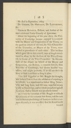 This firft fuggefted to Mr. Ruggle the thought,aild induced him to form the refolution of expofmg itto ridicule, in a reprefentation before King James jWho had long been, and ftill was, expeited to pay' a y;fit to Cambridge, and to whofeprejudices againftLawyers, fuch a fubjeit was peculiarly fuited.