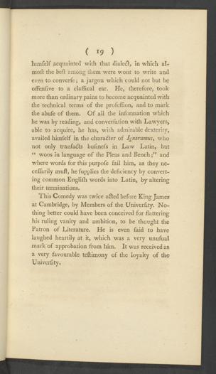 This Comedy was twice added before King James at Cambridge, by Members of the Univerfity. No-thing better could have been conceived for flatteringhis ruling vanity and ambition, to be thought thePatron of Literature. He is even faid to havelaughed heartily at it, which was a very unufualmark of approbation from him. It was received asa very favourable teftimony of the loyalty of theUniverfity,