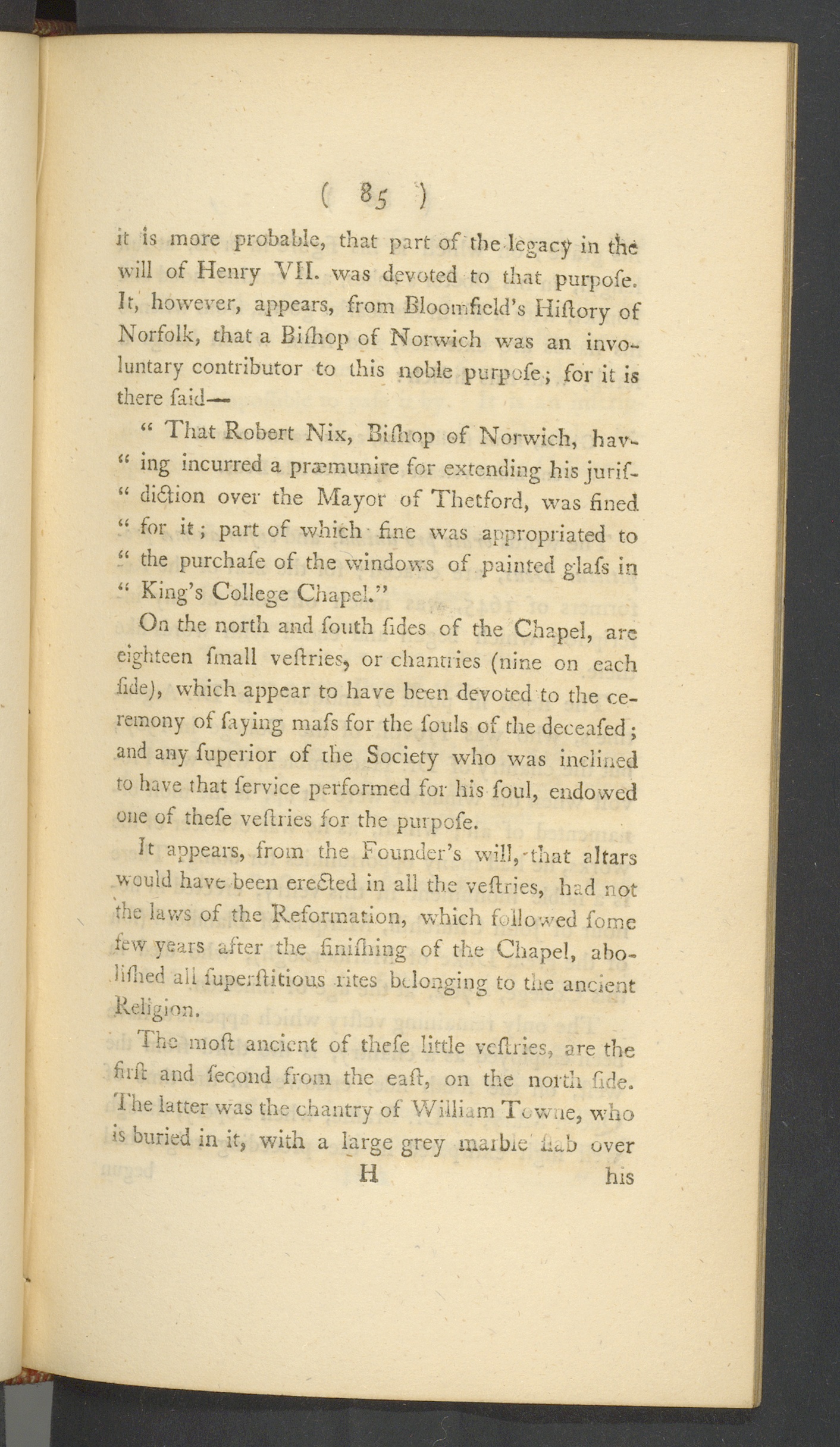 it is more probable, that part of the legacy in thewill of Henry VII . was devoted to that purpofe.It, however, appears, from Bloomfield’s Hiflory ofNorfolk , that a Bifhop of Norwich was an invo-luntary contributor to this noble purpofe; for it isthere faid—