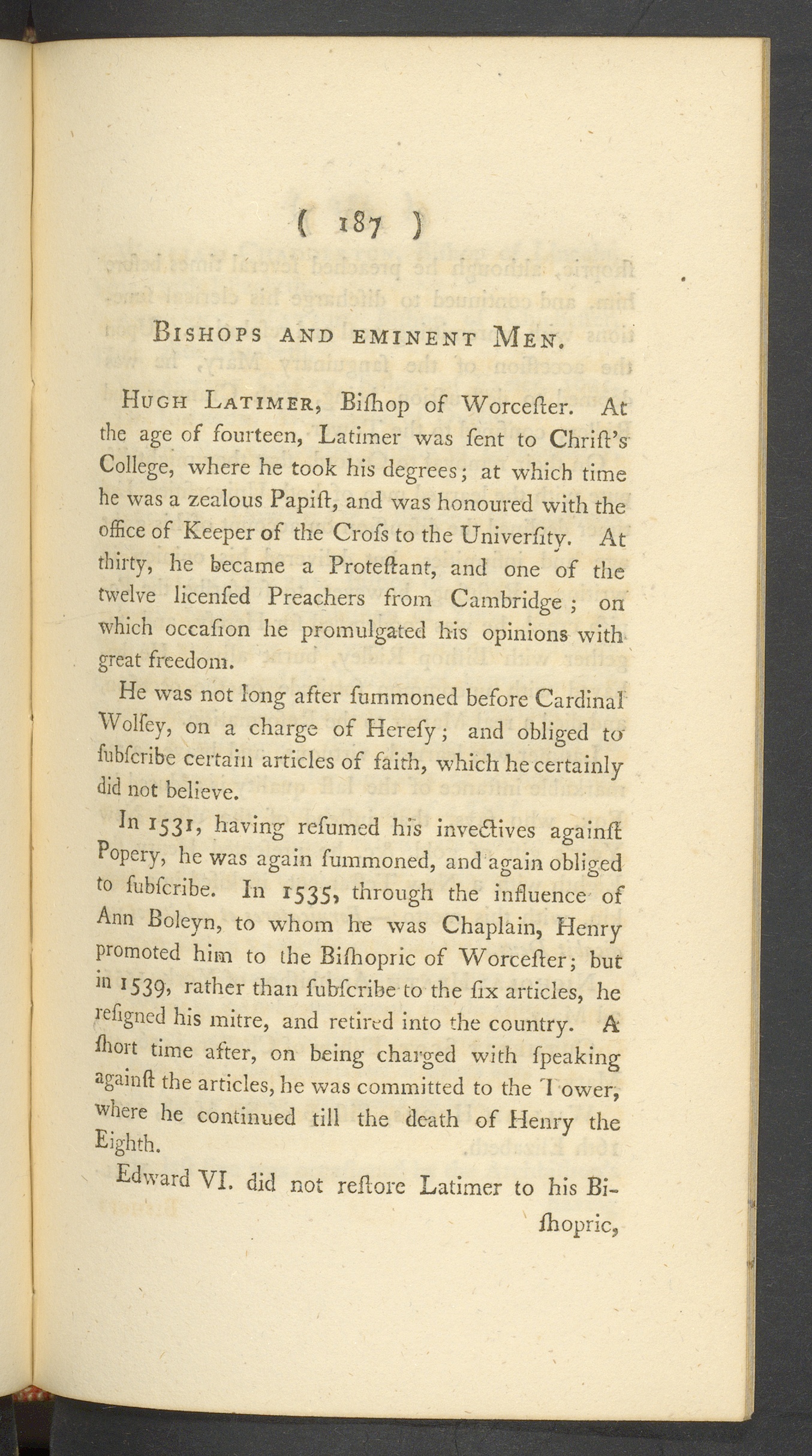 In 1531, having refumed his invedlives againflPopery, he was again fummoned, and again obligedto fubferibe. In I 535 > through the influence ofAnn Boleyn , to whom he was Chaplain, Henrypromoted him to the Bi/hopric of Worcefler; butin 1 539’ rather than fubferibe to the fix articles, herefigned his mitre, and retired into the country. Afliort time after, on being charged with fpeakingagamft the articles, he was committed to the 1 ower,where he continued till the death of Henry the
