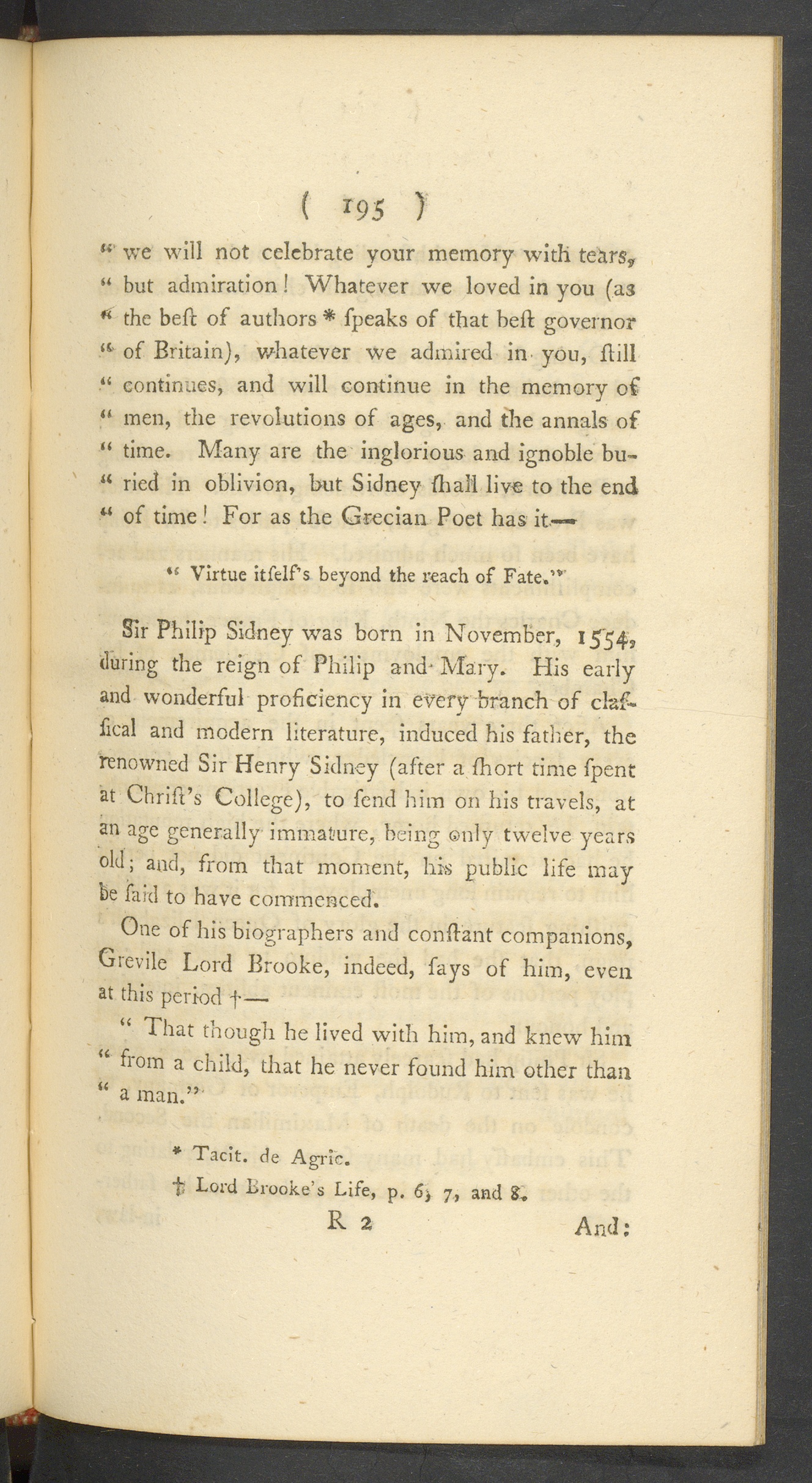 Sir Philip Sidney was born in November, 1 554,during the reign of Philip and- Mary. His earlyand wonderful proficiency in every branch of claf-fical and modern literature, induced his father , therenowned Sir Henry Sidney (after a fhort time fpentat Chrift’s College), to fend him on his travels, atan age generally immature, being ©nly twelve yearsold; and, from that moment, his public life maybe faid to have commenced.