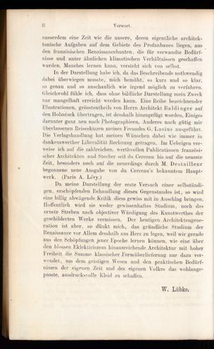 In der Darstellung habe ich. da das Beschreibende nothwendigdabei überwiegen musste, mich bemüht, so kurz und so klar,so genau und so anschaulich wie irgend möglich zu verfahren.Hleichwohl fühle ich, dass ohne bildliche Darstellung mein Zwecknur mangelhaft erreicht werden kann. Eine Reihe bezeichnenderIllustrationen, grösstentlieils von Herrn Architekt Baidinger aufden Holzstock übertragen, ist desshalb hinzugefügt worden, Einigesdarunter ganz neu nach Photographieen, Anderes nach gütig mirüberlassenen Reiseskizzen meines Ereundes G. Easius ausgeführt.Die Verlagshandlung hat meinen Wünschen dabei wie immer indankenswerther Liberalität Rechnung getragen. Im Uebrigen ver-weise ich auf die zahlreichen, werthvollen Publicationen französi-scher Architekten und Stecher seit du Cerceau bis auf die neuesteZeit, besonders noch auf die neuerdings durch M. Destailleurbegonnene neue Ausgabe von du Cerceairs bekanntem Haupt-werk. (Paris A. Levy.)
