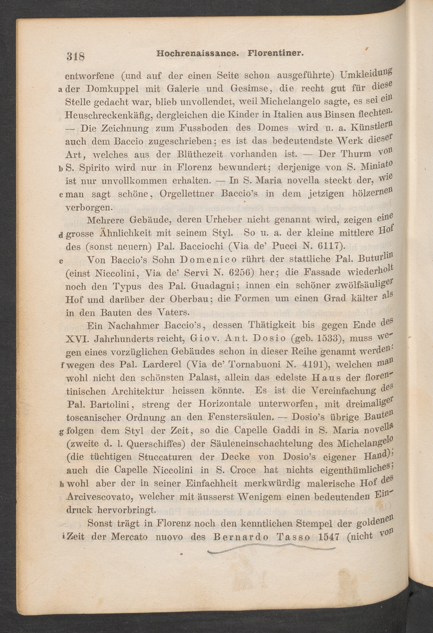 Mehrere Gebäude, deren Urheber nicht genannt wird, zeigen ein ed grosse Ähnlichkeit mit seinem Styl. So u. a. der kleine mittlere H°^des (sonst neuern) Pal. Bacciochi (Via de’ Pucci N. 0117).e Von Baccio’s Sohn Domenico rührt der stattliche Pal. Buturh 11(einst Niccolini , Via de’ Servi N. 6250) her; die Fassade wiederholnoch den Typus des Pal. Guadagni; innen ein schöner zwölfsäulig erHof und darüber der Oberbau; die Formen um einen Grad kälter a* 3in den Bauten des Vaters.