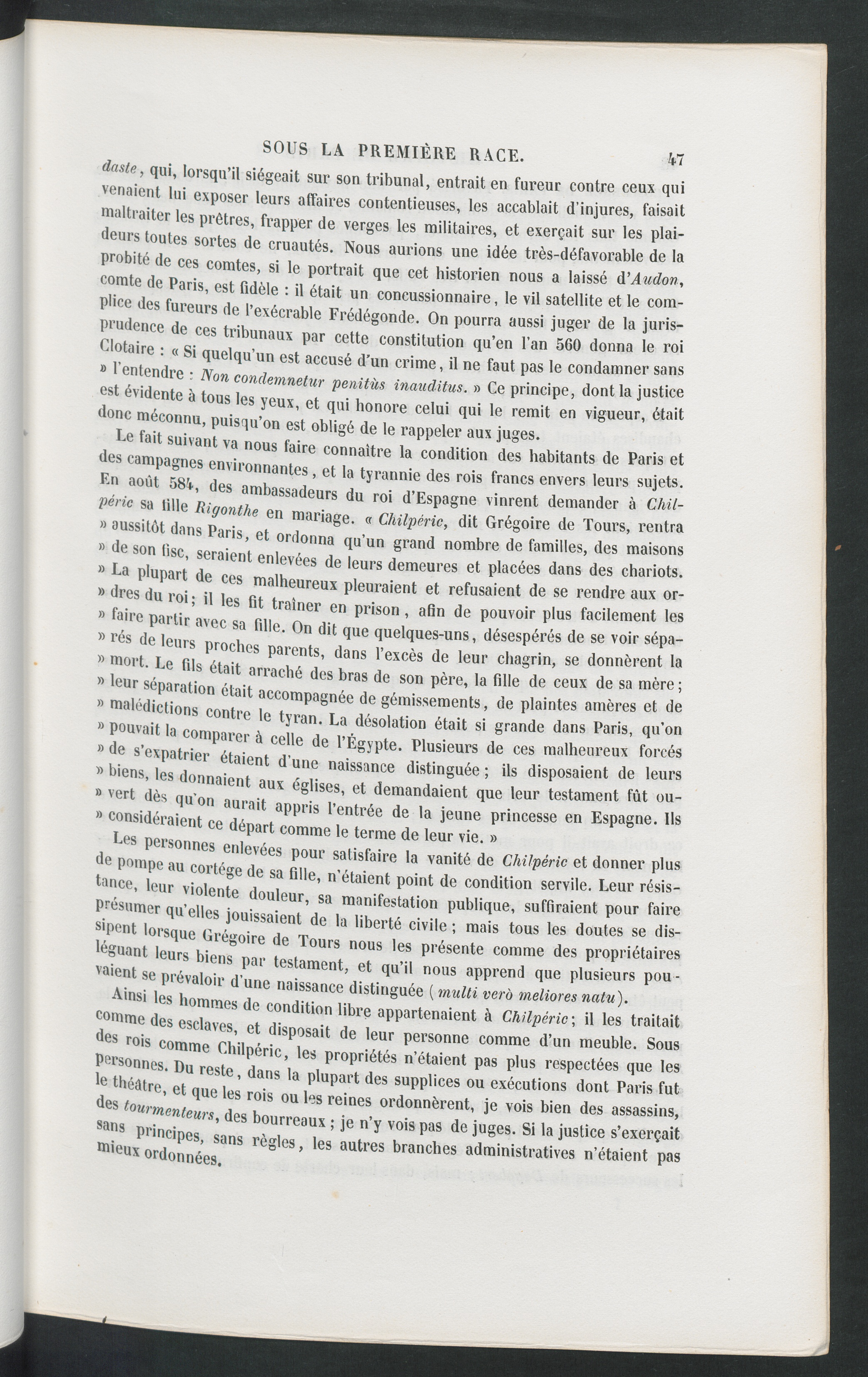dnste, qui, lorsqu’il siégeait sur son tribunal, entrait en fureur contre ceux quivenaient lui exposer leurs affaires contentieuses, les accablait d injures, faisaitmaltraiter les prêtres, frapper de verges les militaires, et exerçait sur les plai-deurs toutes sortes de cruautés. Nous aurions une idée très-défavorable de laprobité de ces comtes, si le portrait que cet historien nous a laissé à’Audon,comte de Paris , est fidèle : il était un concussionnaire, le vil satellite et le com-plice des fureurs de l’exécrable Frédégonde . On pourra aussi juger de la juris-prudence de ces tribunaux par cette constitution qu’en l’an 560 donna le roiClotaire : « Si quelqu’un est accusé d’un crime, il ne faut pas le condamner sans8 l’entendre : Non condemnetur penitùs inauditus. » Ce principe, dont la justiceest évidente à tous les yeux, et qui honore celui qui le remit en vigueur, était