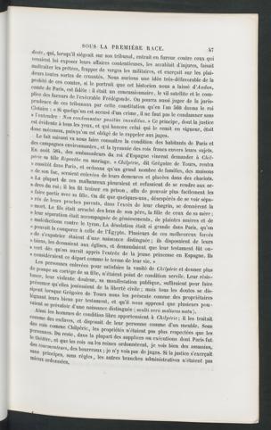 Les personnes enlevées pour satisfaire la vanité de Chilpéric et donner plusde pompe au cortège de sa fille, n’étaient point de condition servile. Leur résis-tance, leur violente douleur, sa manifestation publique, suffiraient pour faireprésumer qu’elles jouissaient de la liberté civile ; mais tous les doutes se dis-sipent lorsque Grégoire de Tours nous les présente comme des propriétairesléguant leurs biens par testament, et qu’il nous apprend que plusieurs pou -vaient se prévaloir d’une naissance distinguée ( multi ver à meliores natu ).