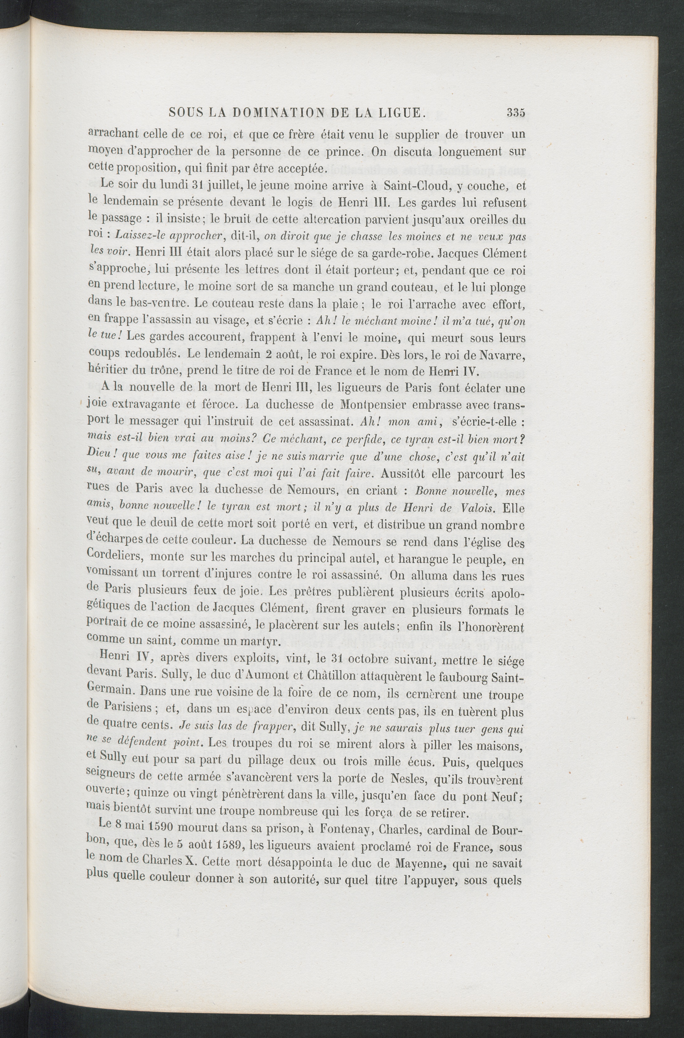 A la nouvelle de la mort de Henri III , les ligueurs de Paris font éclater unejoie extravagante et féroce. La duchesse de Monlpensier embrasse avec trans-port le messager qui l’instruit de cet assassinat. Ah! mon ami, s’écrie-t-elle :ôtais est-il bien vrai au moins? Ce méchant, ce perfide, ce tyran est-il bien mort?Dieu ! que vous me faites aise ! je ne suis marrie que d’une chose, c’est qu’il n’aitsu > avant de mourir, que c’est moi qui l’ai fait faire. Aussitôt elle parcourt lesrues de Paris avec la duchesse de Nemours , en criant : Bonne nouvelle, mesamis, bonne nouvelle! le tyran est mort; il n’y a plus de Henri de Valois . Elley cut que le deuil de cette mort soit porté en vert, et distribue un grand nombred écharpes de cette couleur. La duchesse de Nemours se rend dans l’église desCordeliers, monte sur les marches du principal autel, et harangue le peuple, envomissant un torrent d’injures contre le roi assassiné. On alluma dans les ruesde Paris plusieurs feux de joie. Les prêtres publièrent plusieurs écrits apolo-gétiques de l’action de Jacques Clément , firent graver en plusieurs formats lePortrait de ce moine assassiné, le placèrent sur les autels; enfin ils l’honorèrentcomme un saint, comme un martyr.