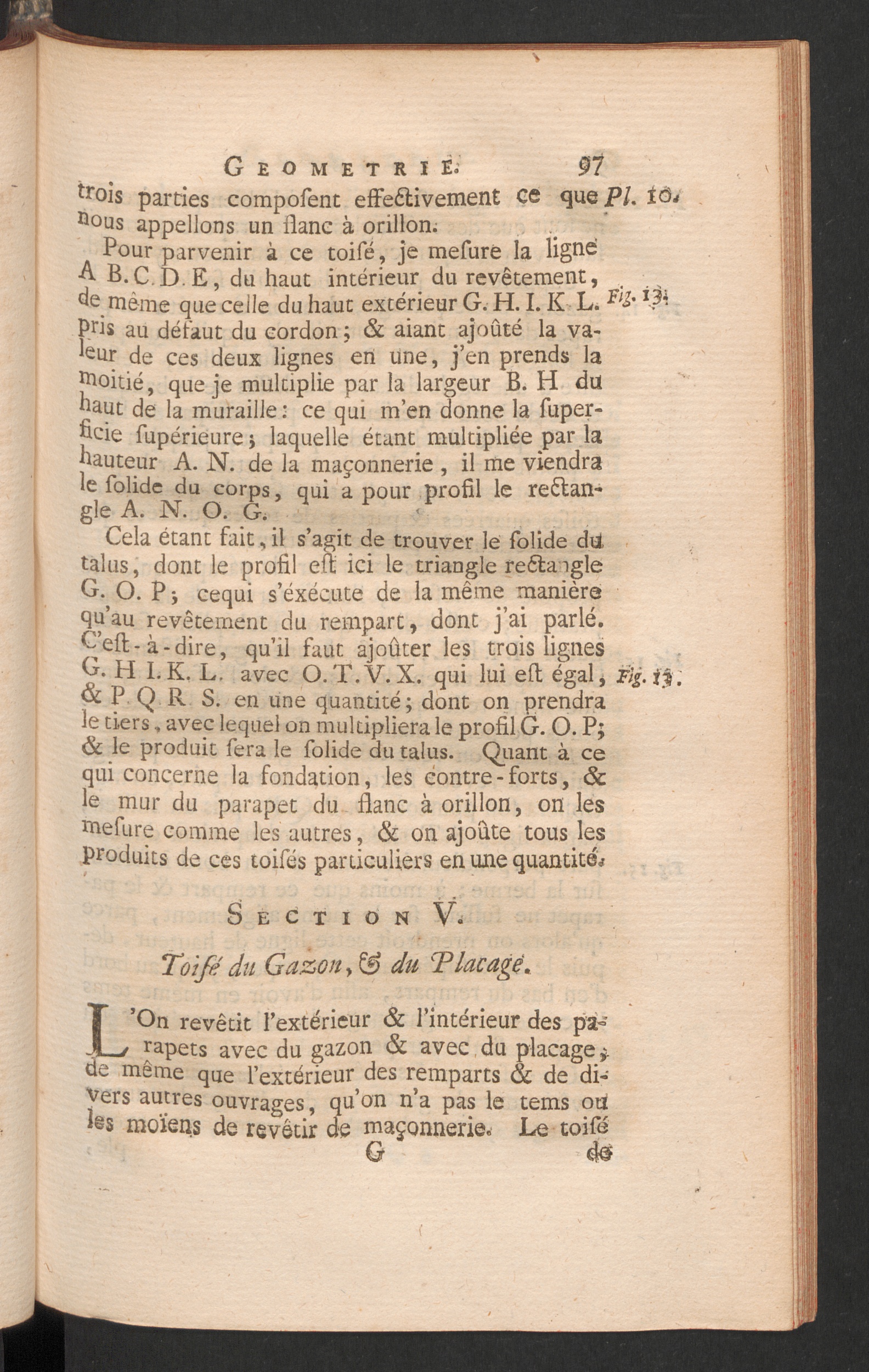 Cela étant fait, il s’agit de trouver le solide diitalus, dont le profil est ici le triangle rectangleG. O. P ; cequi s’éxécute de la même manièrequ'au revêtement du rempart, dont j ai parlé.C’est-à-dire, qu’il faut ajoûter les trois lignesG. H I. K. L. avec O.T.V.X. qui lui est égal j Etz. tZ& P Q R 8. en une quantité; dont on prendrale tiers, avec lequel on multipliera le profil G. O. P;