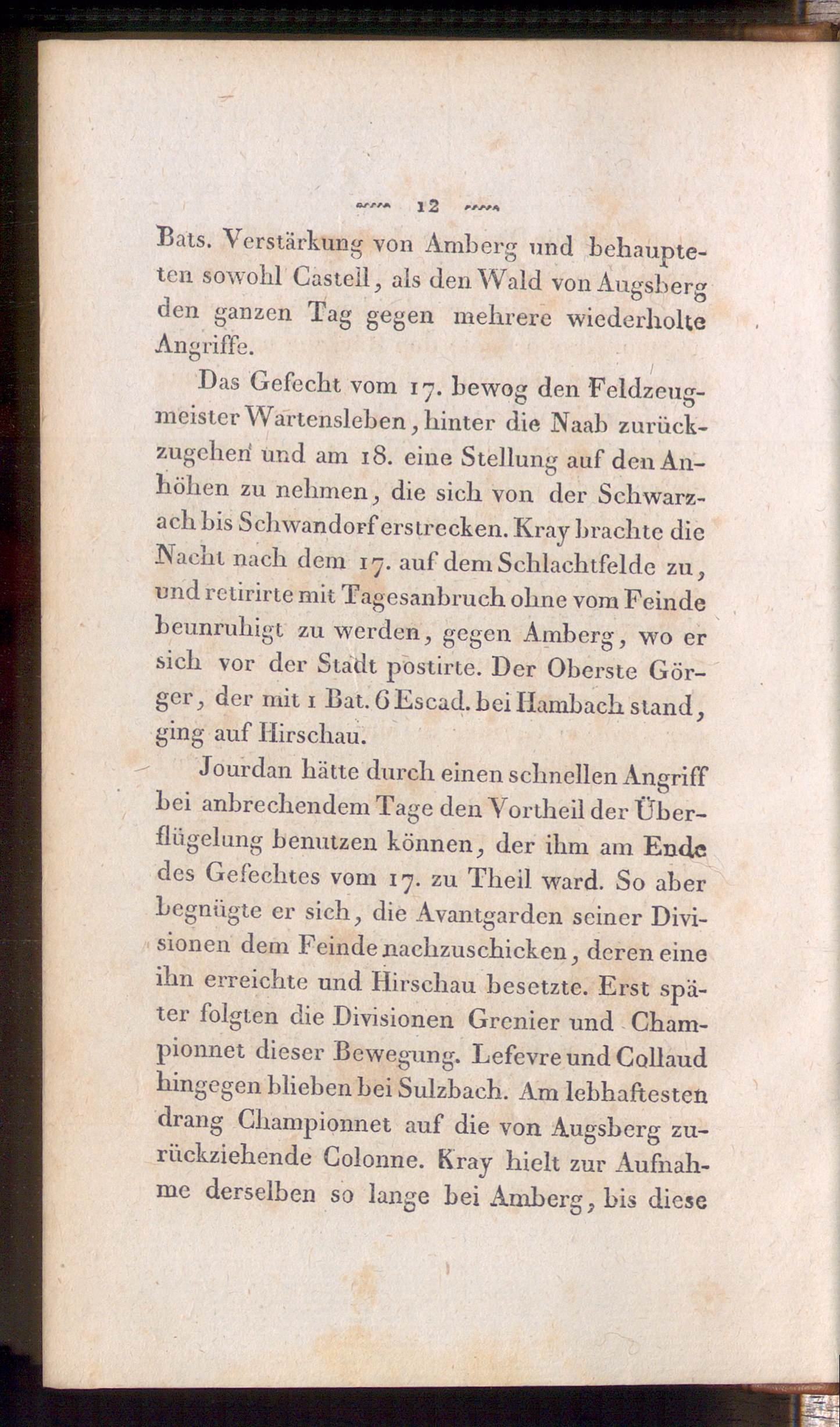 fliigelung benutzen können, der ihm am Endedes Gefechtes vom 17. zu Tlieil ward. So aberbegnügte er sich, die Avantgarden seiner Divi-sionen dem Feinde nachzuschicken, deren eineihn erreichte und Hirschau besetzte. Erst spä-ter folgten die Divisionen Grcnier und Cham-pionnet dieser Bewegung. Lefevre und Collaudhingegen blieben bei Sulzbach. Am lebhaftestendrang Championnet auf die von Augsberg zu-rückziehende Colonne. Kray hielt zur Aufnah-me derselben so lange bei Amberg , bis diese