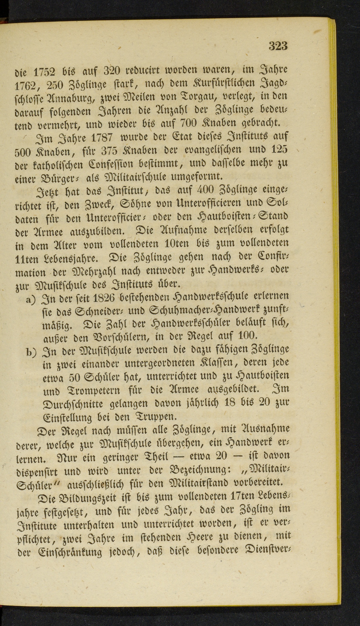 Im Jahre 1787 wurde der Etat dieses Instituts auf500 Knaben, für 375 Knaben der evangelischen und 125der katholischen Confession bestimmt, und dasselbe mehr zueiner Bürger- als Militairschule umgeformt.