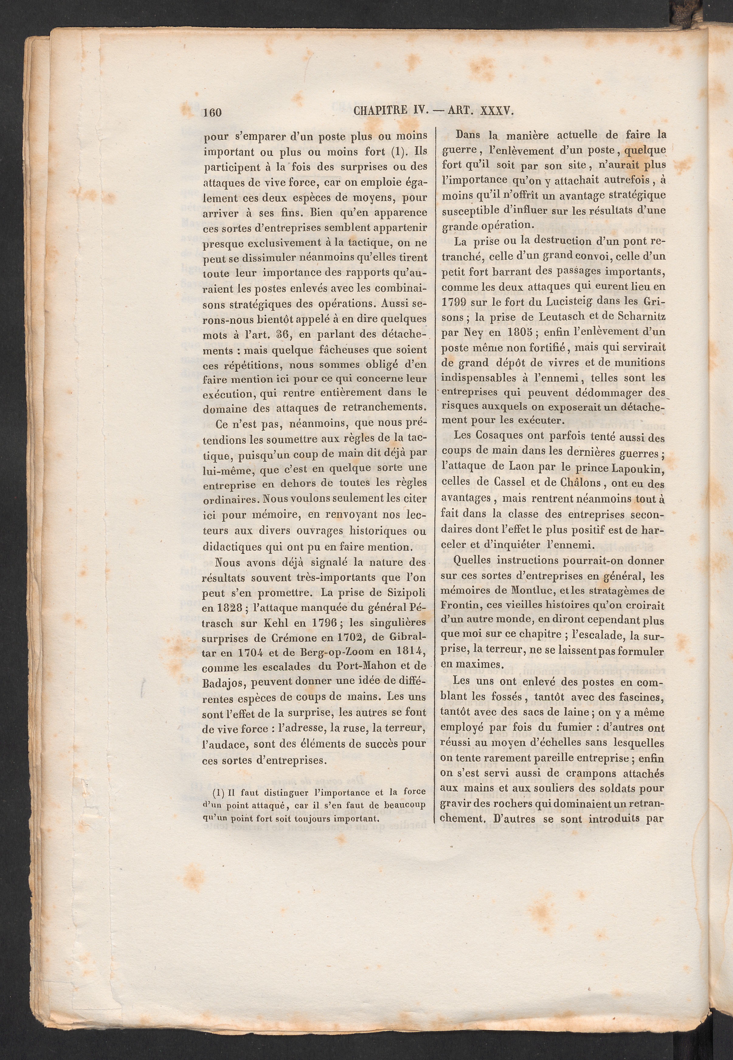 Ce n’est pas, néanmoins, que nous pré-tendions les soumettre aux règles de la tac-tique, puisqu’un coup de main dit déjà parlui-même, que c’est en quelque sorte uneentreprise en dehors de toutes les réglésordinaires. Nous voulons seulement les citerici pour mémoire, en renvoyant nos lec-teurs aux divers ouvrages historiques oudidactiques qui ont pu en faire mention.