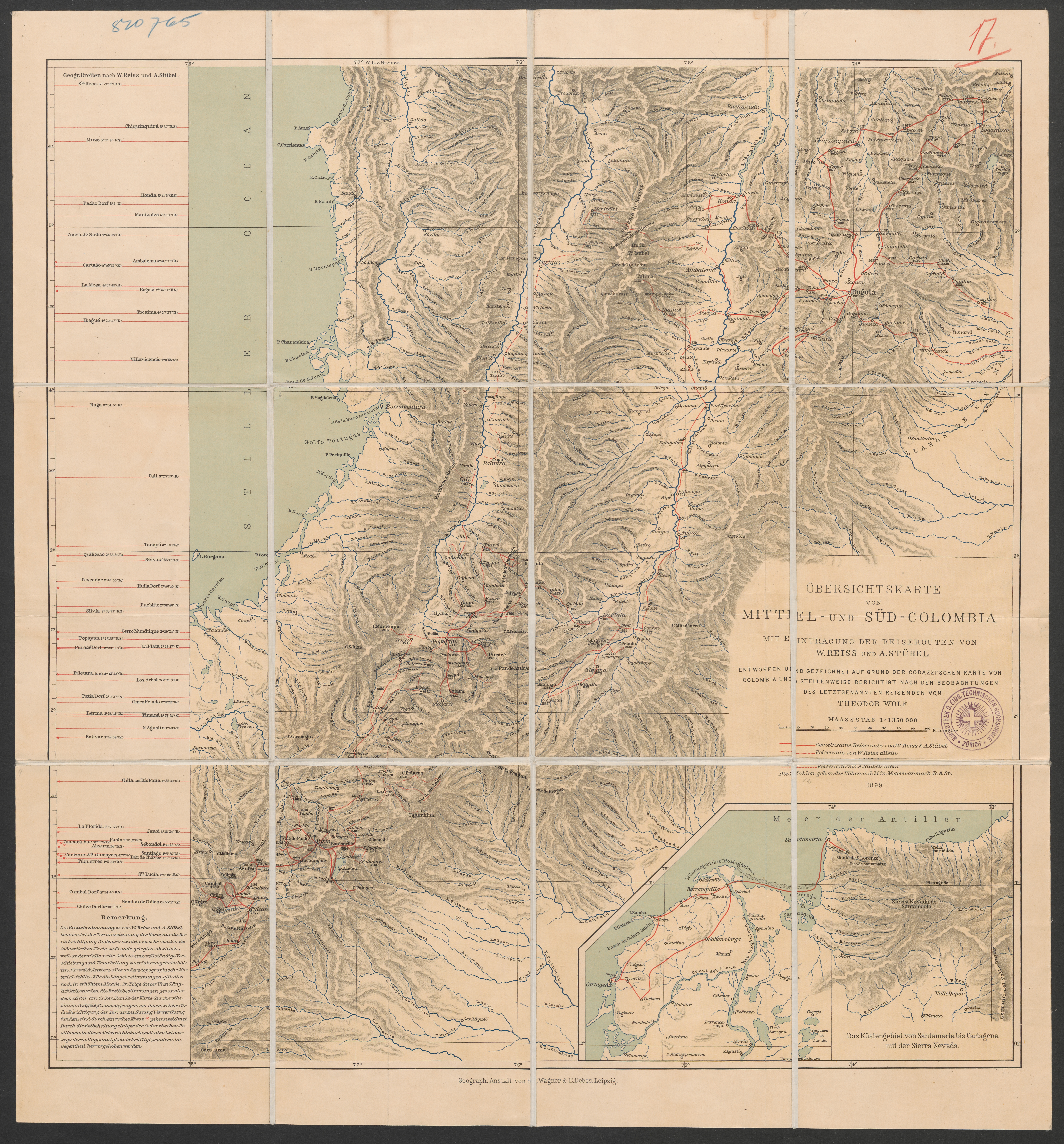 Übersichtskarte von Mittel- und Süd-Colombia : mit Eintragung der Reiserouten von W. Reiss und A. Stübel : entworfen und gezeichnet auf Grund der Codazzi'schen Karte von Colombia und stellenweise berichtigt nach den Beobachtungen des letztgenannten Reisenden / von Theodor Wolf
