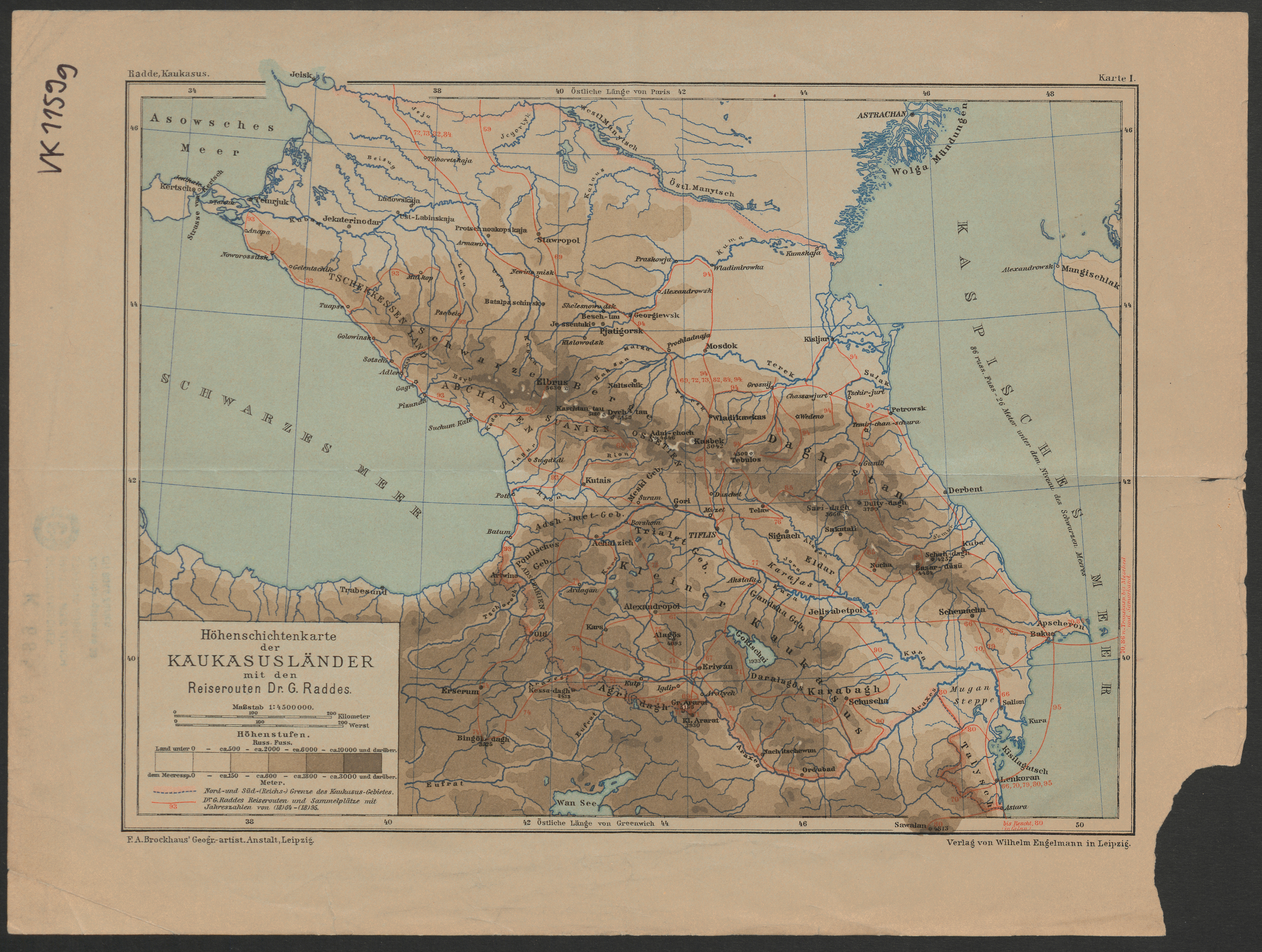 Höhenschichtenkarte der Kaukasusländer mit Reiserouten Dr. G. Raddes / Radde