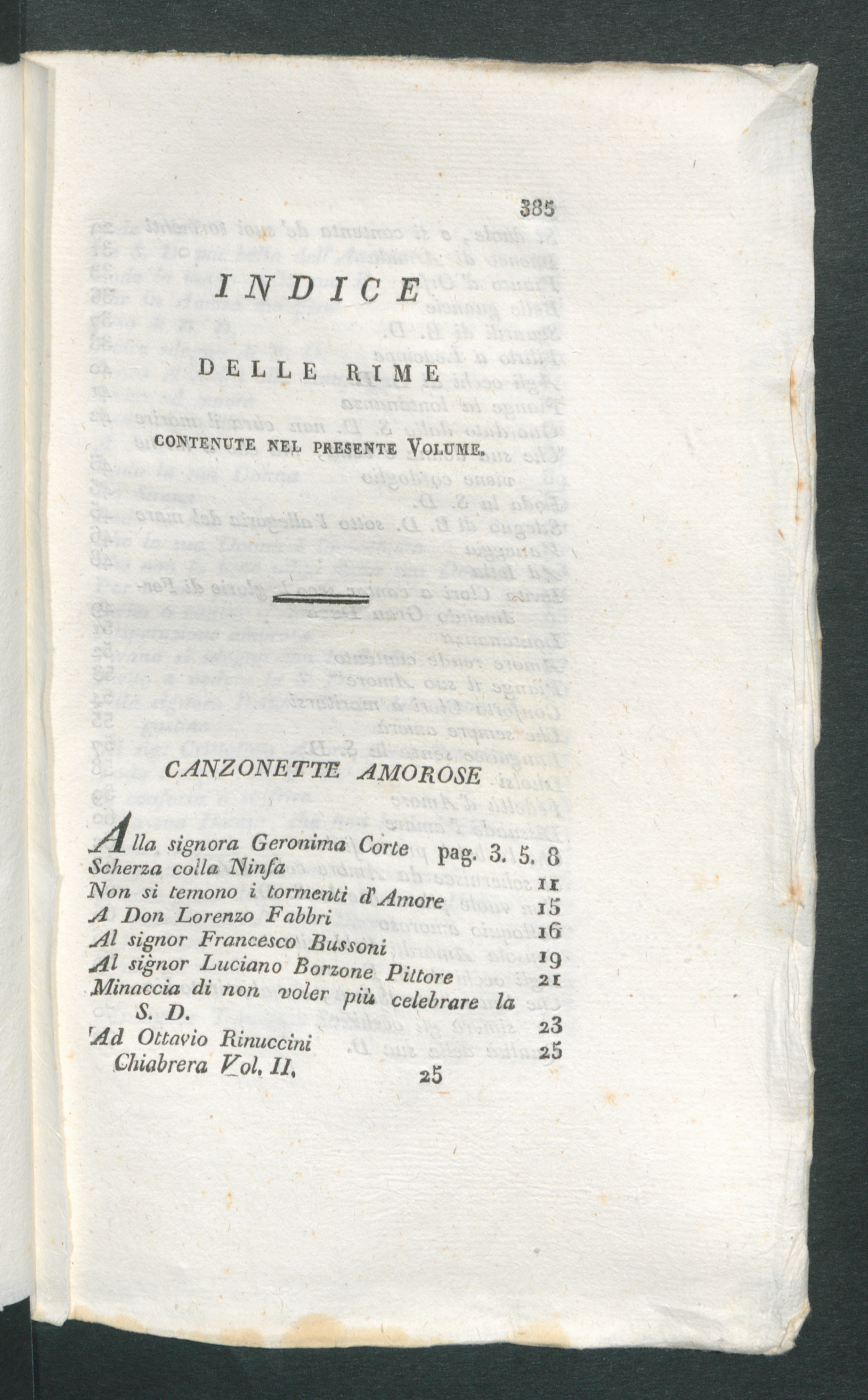 2 (1807) Rime di Gabriello Chiabrera contenente canzonette amorose e morali, scherzi, sonetti, epitaffj, vendemmie, egloghe e sermoni / [di Gabriello Chiabrera]