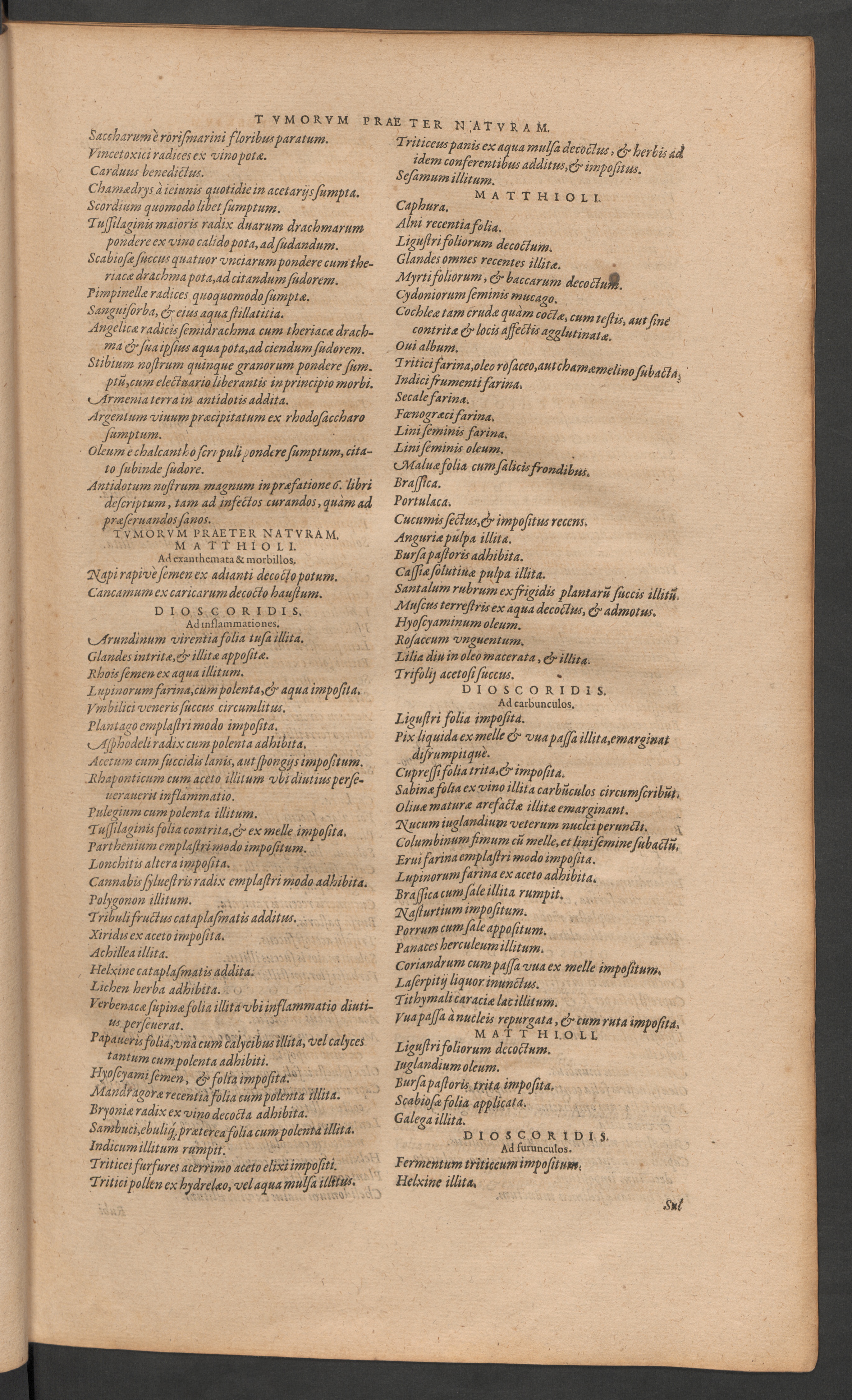 Petri Andreae Matthioli ... Opera quae extant omnia: hoc est, commentarii in VI. libros Pedacii Dioscoridis Anazarbei de medica materia ... nunc a Casparo Bauhino ... post diversarum editionum collationem infinitis locis aucti: Synonymiis quoque plantarum et notis illustrati: Adiectis plantarum iconibus ... De ratione distillandi aqua ex omnibus plantis: et quomodo genuini odores in ipsis aquis conservari possint. Item apologia in Amatum Lusitanum ... Epistolarum medicinalium libri quinque. Dialogus de morbo Gallico