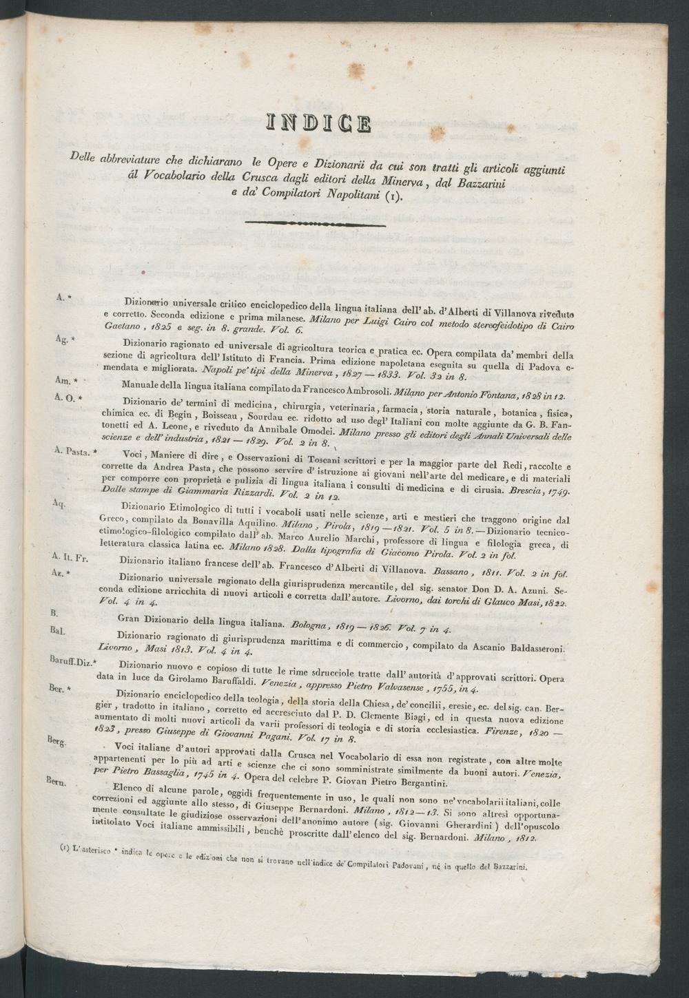 Indice delle abbreviature che dichiarano le opere e dizionarii da cui son tratti gli articoli aggiunti [...].